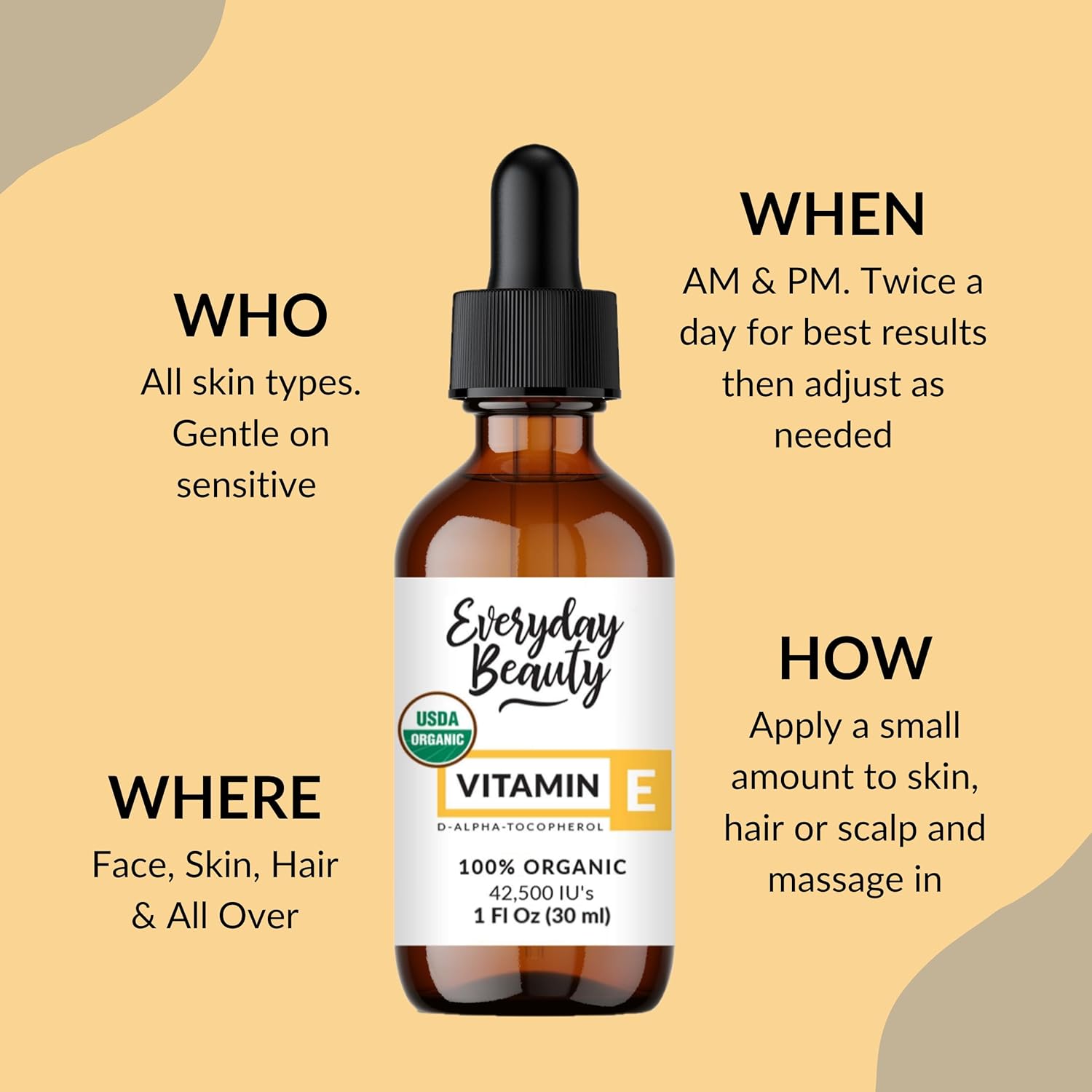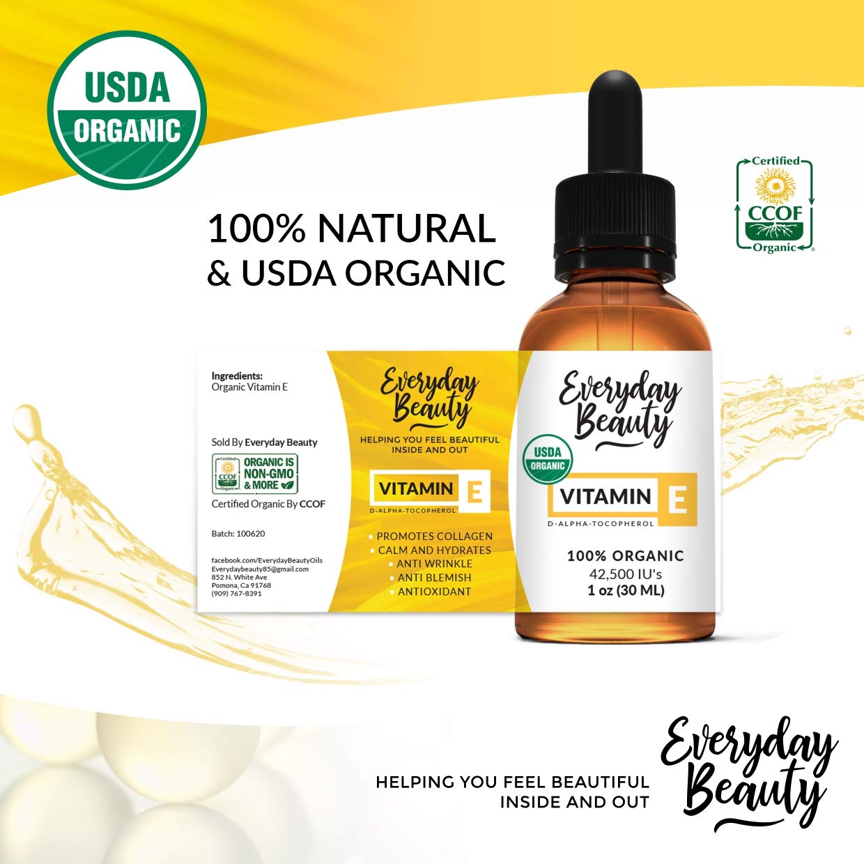 100% Organic USDA Certified All Natural and Pure Vitamin E – D-Alpha Tocopherol. Plant Based, Vegan, Cruelty-Free