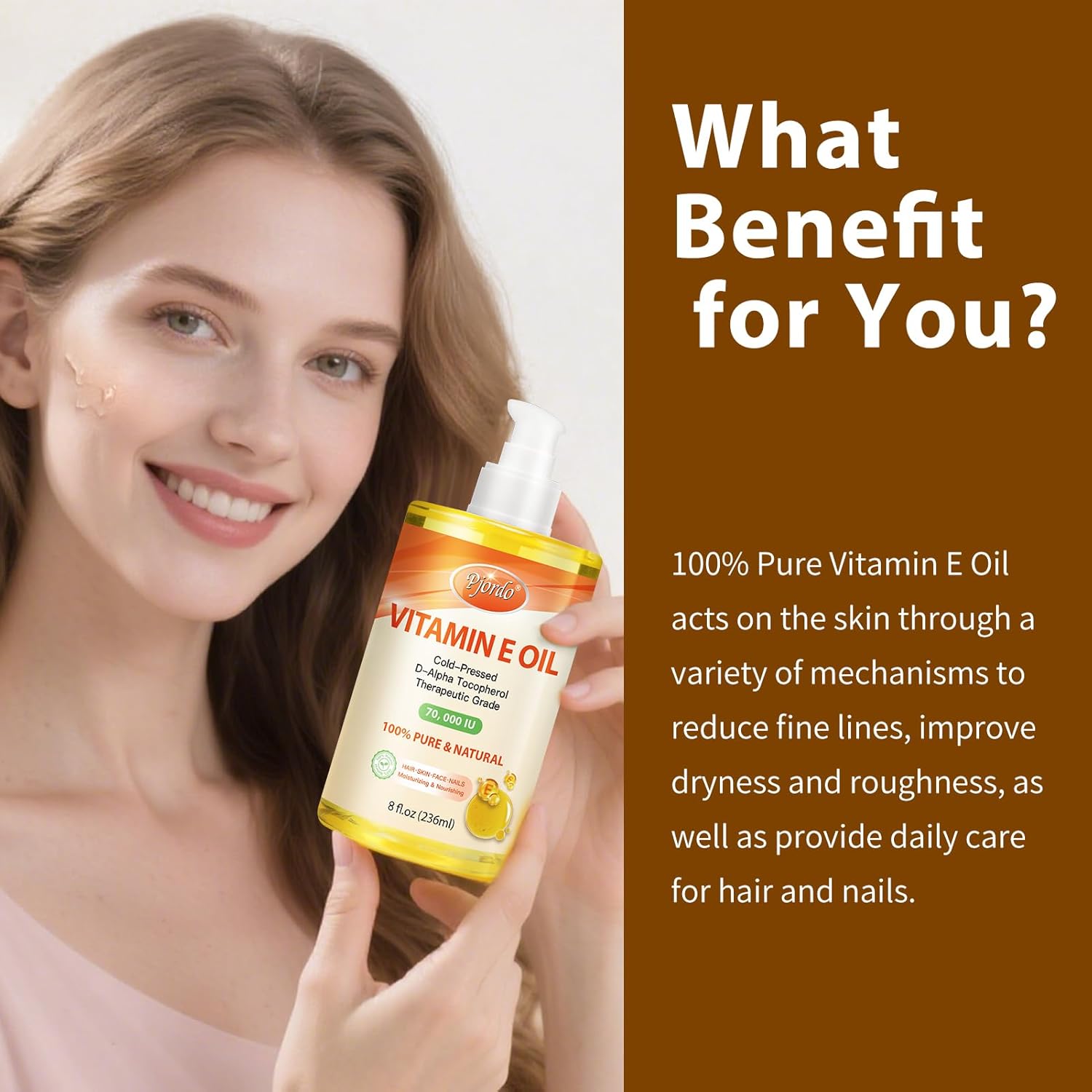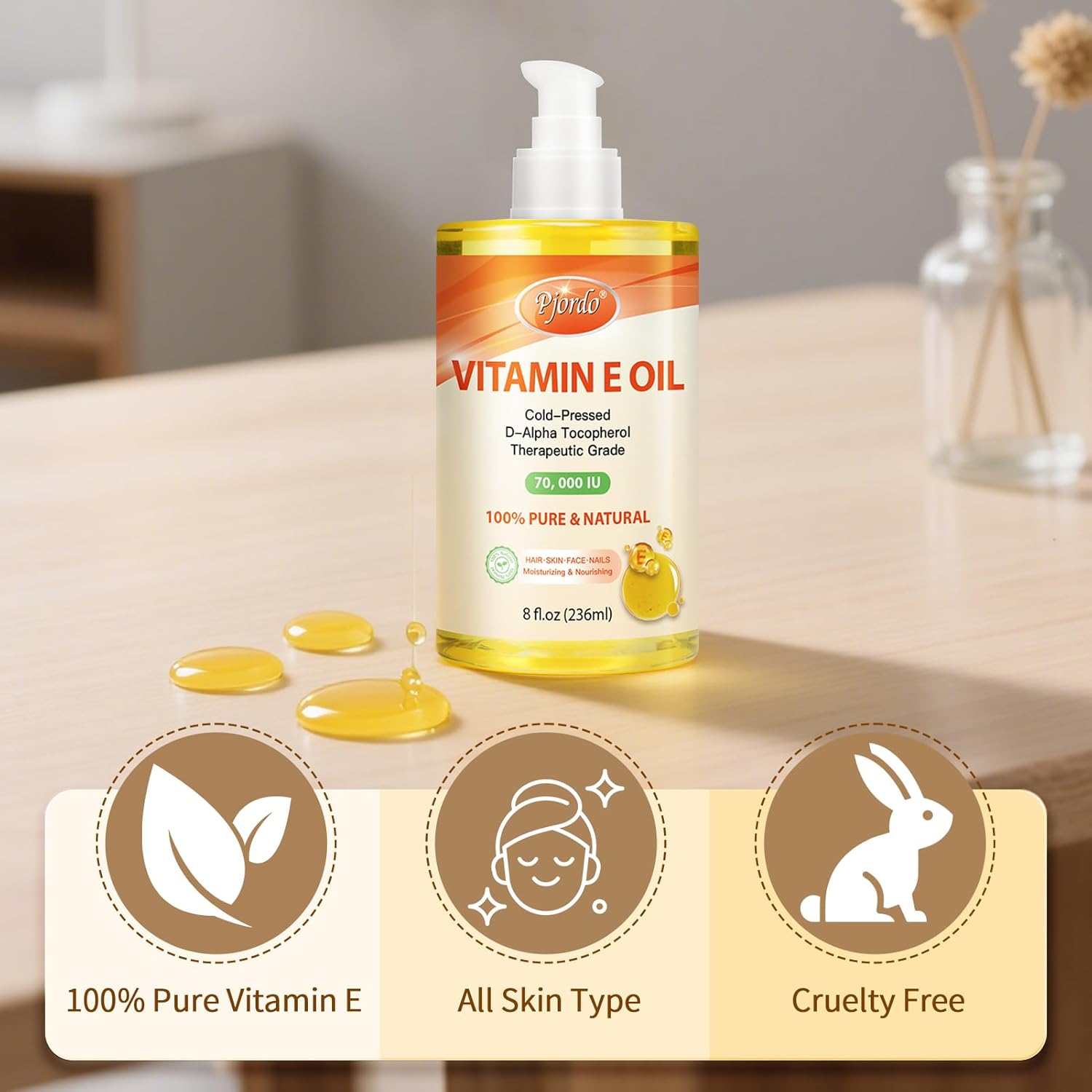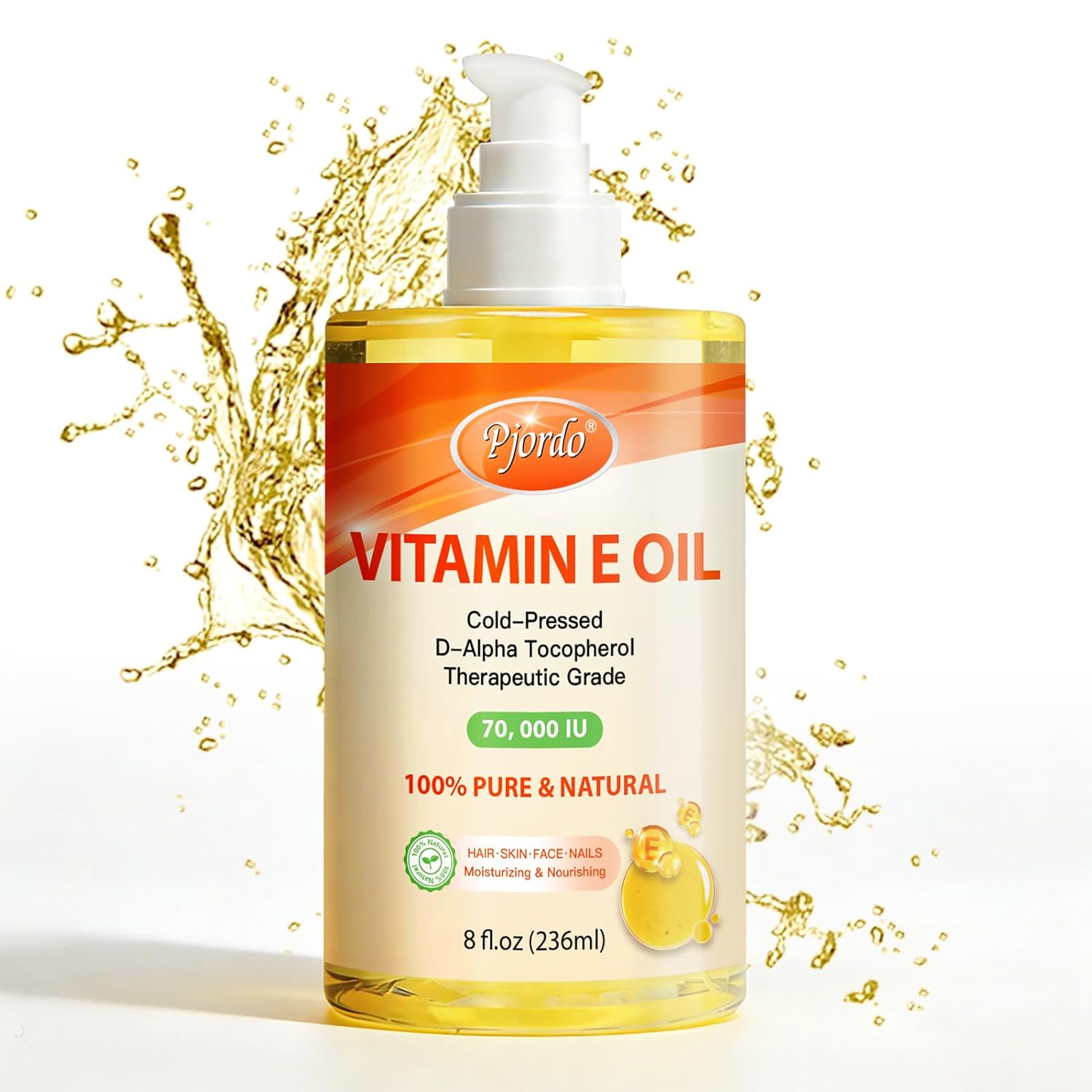 Product Summary: Pjordo 100% Pure Vitamin E Oil, 70,000 IU Organic Vitamin E for Scars, Skin, Face, Nails & Hair, Cold-Pressed Body Oil Nourishes & Moisturizes All Skin Types for Improving Skin Texture