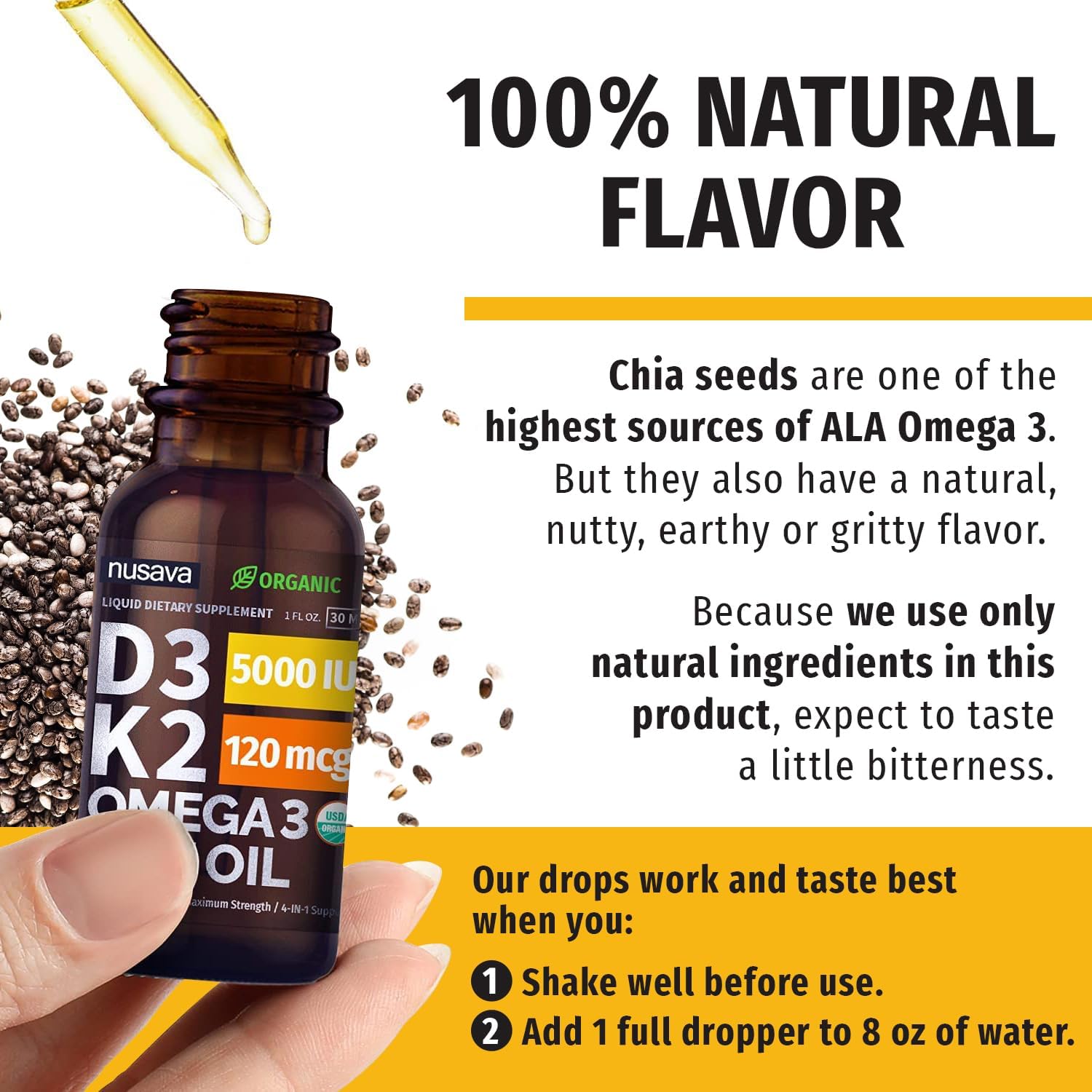 Liquid Vitamin K2 D3 Formulated for Maximum Potency: Each dose contains 125 mcg (5000IU) of Vitamin D3, 120 mcg of Vitamin K, 250mg of Omega 3, and a potent blend of organic ingredients.