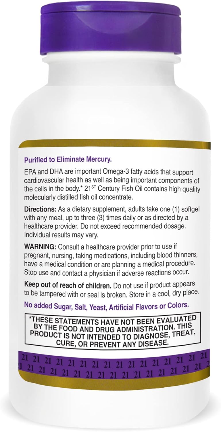 The 21st Century Fish Oil 1000 mg provides a rich source of EPA and DHA omega-3 fatty acids, which are important for cardiovascular health and cellular integrity*. Filtered to eliminate mercury, our molecularly distilled formula helps ensure a clean, thoughtfully formulated supplement for daily use.