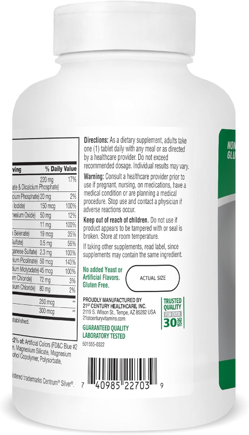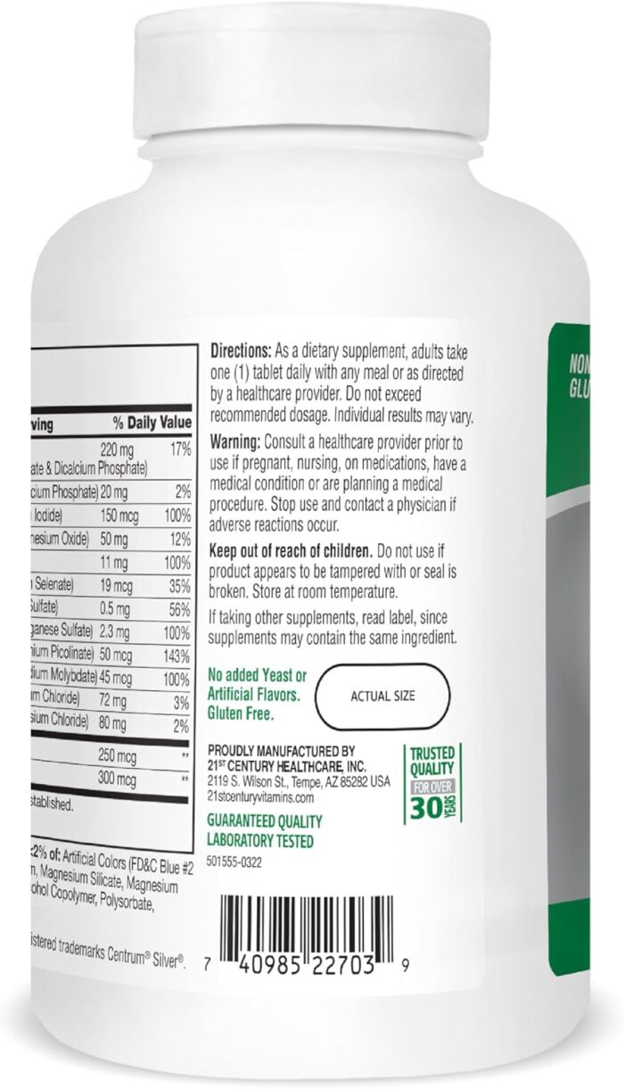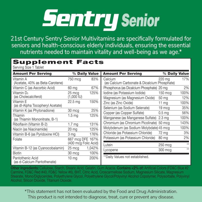 A balanced diet is the best source of nutrients to support a healthy lifestyle. Adding 21ST Century Sentry Senior Adults 50+ multivitamin and multimineral supplement to a daily routine can support nutrient gaps that may occur with age and makes it an excellent choice for those looking to maintain overall wellness and vitality in their golden years.