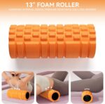 5 in 1 Foam Roller Muscle Massage Set: Package includes 1* hollow foam roller(13″*5″), 1* Muscle Roller Stick(15″), 1* massage ball(Φ2.5″), 1* stretching band(24″*2″), 1 storage bag; Protected by US Patent Nos: 9,345,921; 9,539,167 ; 9,656,112 ; 10,278,890 and 10,695,260