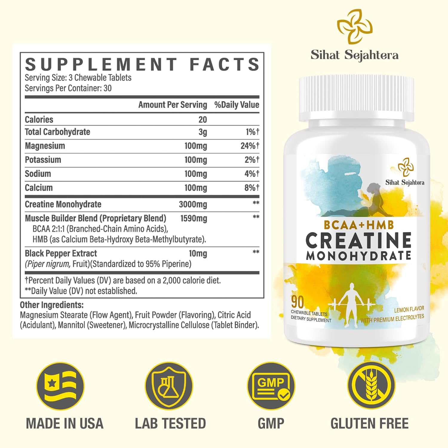 8-in-1 COMPLEX BLEND: Each serving of our Creatine Monohydrate Chewable Tablets delivers a potent 5000 mg blend, including Creatine Monohydrate, BCAA 2:1:1, HMB, and essential electrolytes (Magnesium, Potassium, Sodium, Calcium). This comprehensive formula is crafted to support strength, recovery, and overall performance during your routine