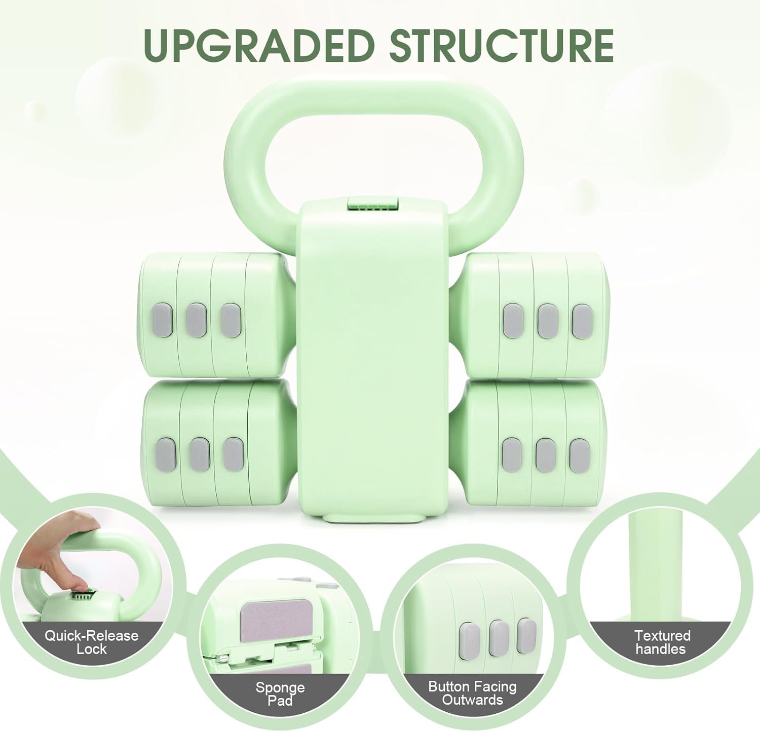 【Quick & Easy Weight Changes】Change weights instantly with a simple button press—no tools or complicated setup required. The secure lock holds everything firmly in place, even during tough workouts like kettlebell swings.