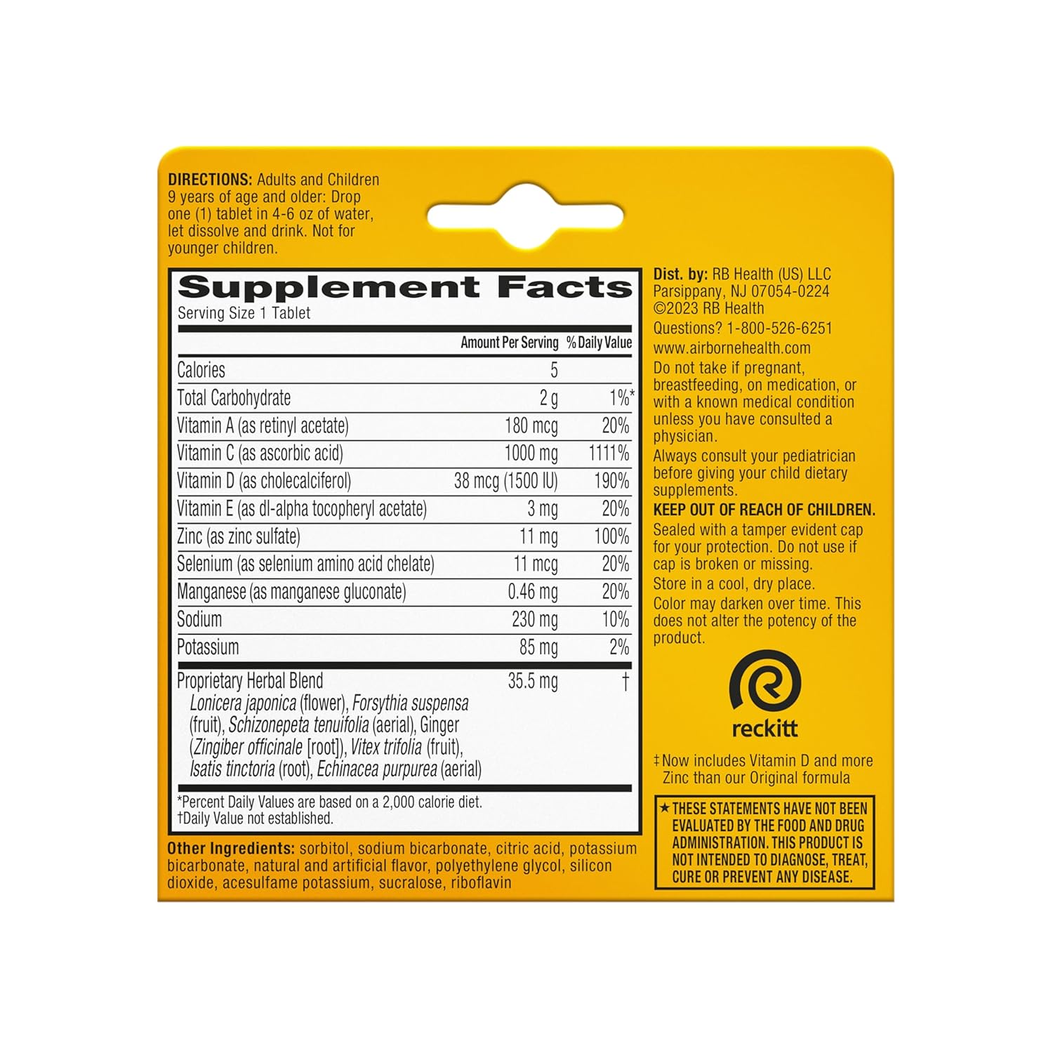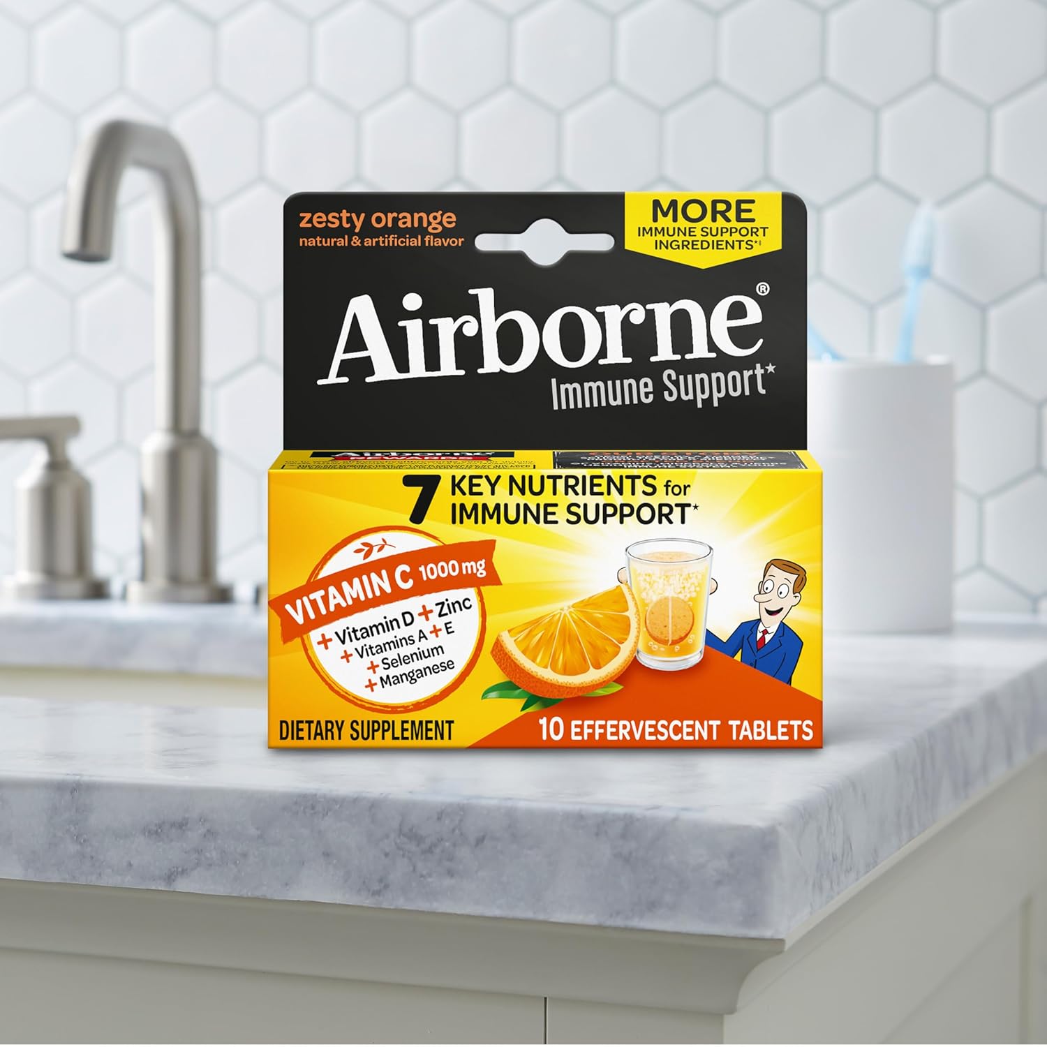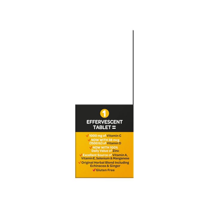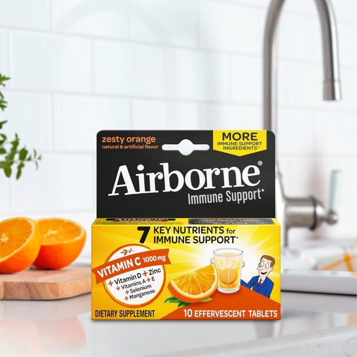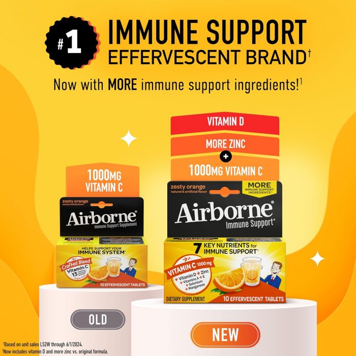 VITAMIN C 1000mg: Airborne immune support effervescent tablets are packed with 1000mg Vitamin C per serving, which helps support your immune system. ZINC SUPPLEMENT: These Vitamin C with Zinc effervescent tablets NOW contain 100 percent of your daily value of Zinc, which plays a central role in your immune system and is essential for the functioning and signaling of immune cells. VITAMIN D SUPPLEMENTS: These fizzy drink tablets NOW contains 15000IU of Vitamin D3, important for proper functioning of the immune system*. POWERFUL ANTIOXIDANTS: Airborne immune support tablets contains the antioxidants Vitamin A to support immune health, Vit C to support immune health, Vitamin E to help fight free radicals, and Zinc to help maintain healhy immune cells. COMPLETE FORMULA: This crafted blend of 7 immune support vitamins is our most complete immune support formula yet.* It comes with minerals & herbs and it is an excellent source of Zinc and Selenium. NUMBER ONE IMMUNE SUPPORT EFFERVESCENT BRAND: Airborne is the Number 1 Immune Support Gummy, Effervescent & Chewable Brand (Based on unit sales L52W through 7/24/2024). SUGAR FREE: Airborne Immune Support Effervescent Tablets are Sugar Free, Gluten Free, Lactose Free, Caffeine Free, and manufactured in the USA with ingredients sourced globally. TASTY & CONVENIENT: Add this refreshing Zesty Orange flavored drink to your travel essentials. These dissolvable Vitamin C tablets are convenient and easy for adults and for kids 12plus to take at home or on the go. HOW TO ENJOY: Drop one of these mens multivitamins & women multivitamins tablets into 4-6 ounces of water, let it dissolve and drink. These drinks are so delicious so you can enjoy with your kids 9 years of age and above. *These statements have not been evaluated by the Food and Drug Administration. This product is not intended to diagnose, treat, cure or prevent any disease.