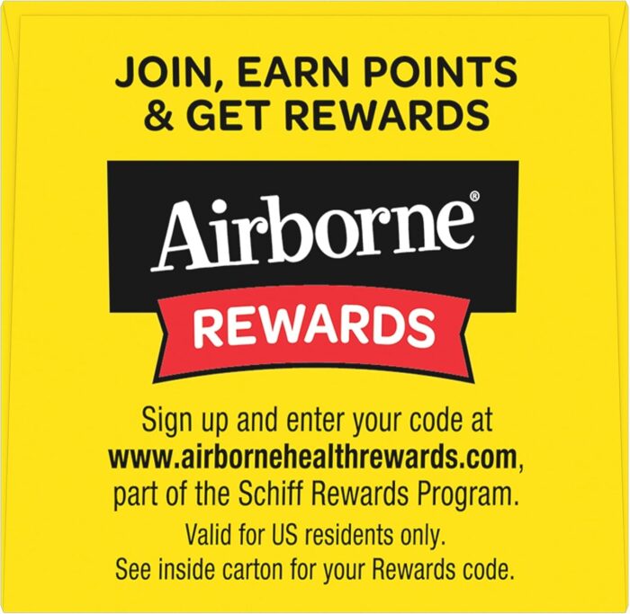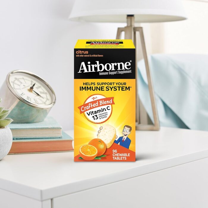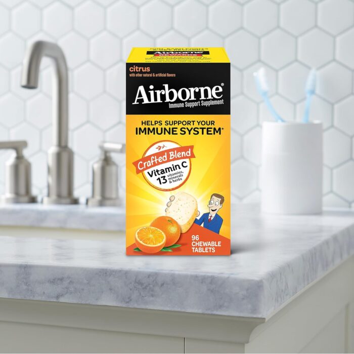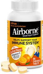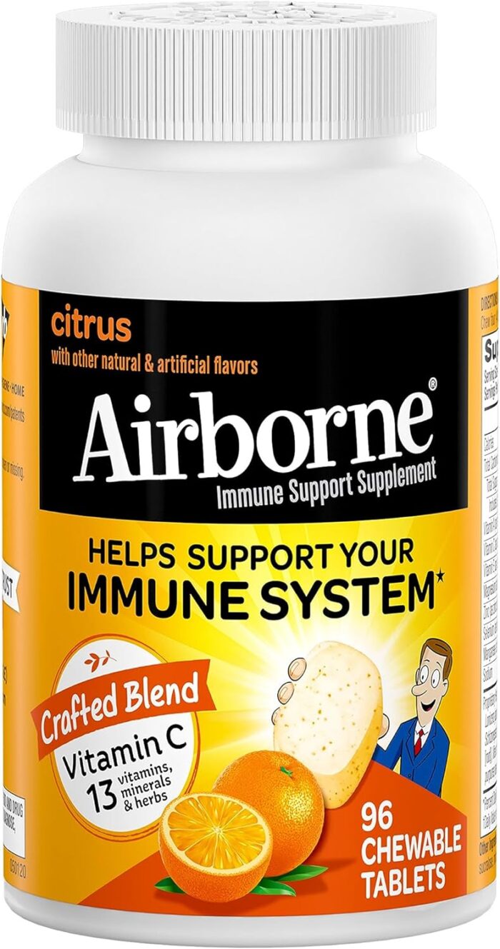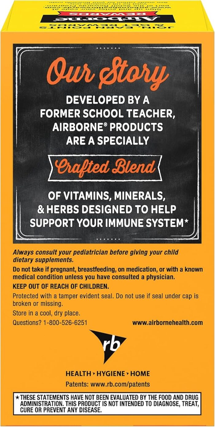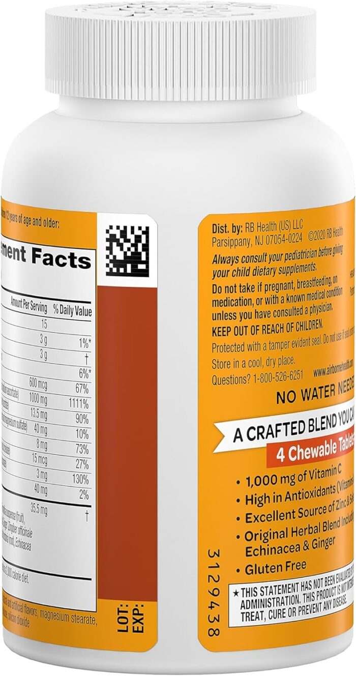 Airborne Chewable Tablets provides immune support in a great-tasting and easy-to-take form; no water needed. Each serving (4 tablets) delivers a blast of 1000 mg of Vitamin C and 13 vitamins, minerals, and herbs, including Echinacea, and ginger.* Same immune support found in Airborne Effervescent Tablets and Gummies. Gluten Free. Visit AirborneHealth.com to learn more. *These Statements have not been evaluated by the Food and Drug Administration. This product is not intended to diagnose, treat, cure or prevent any disease.