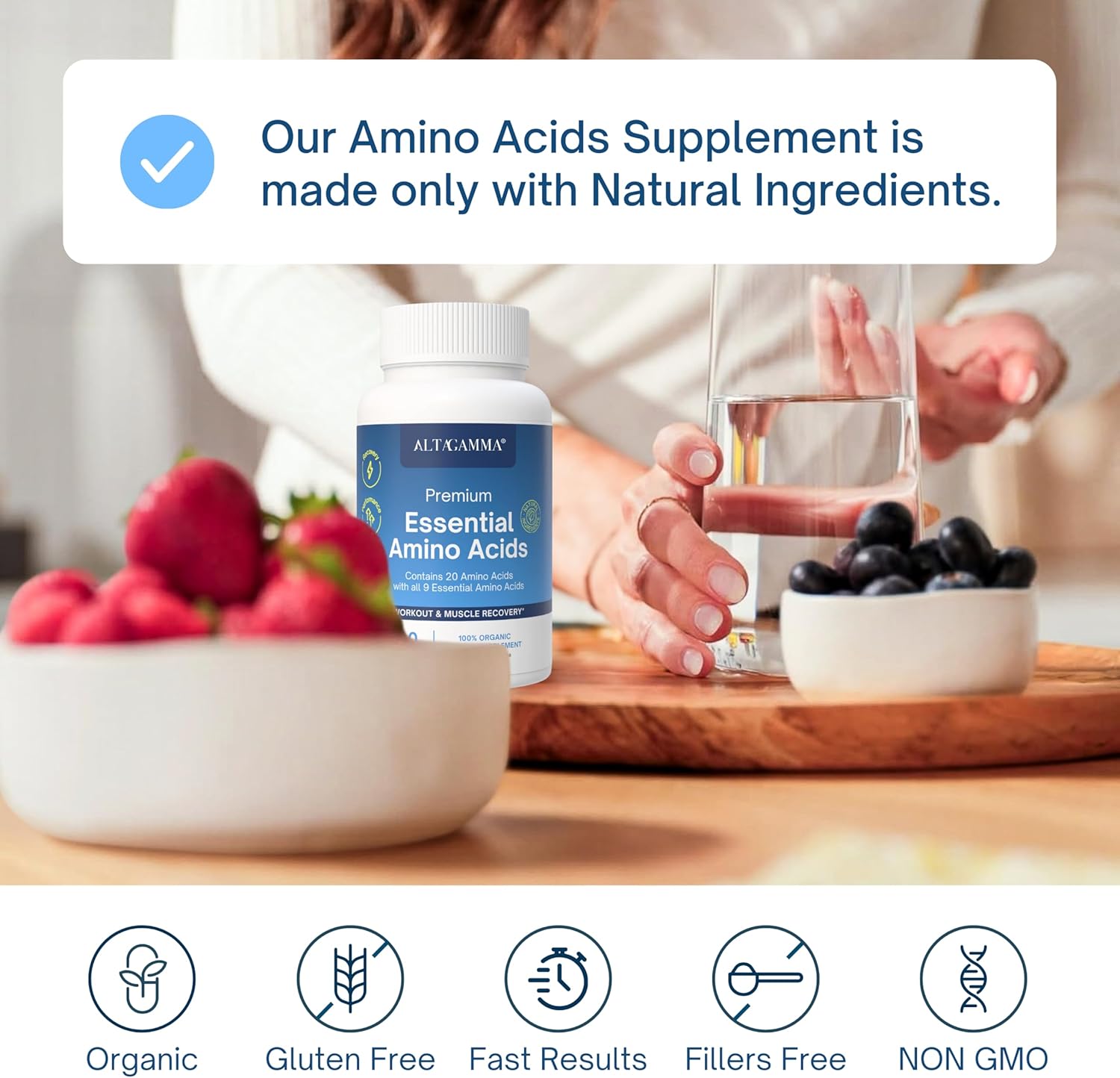FORMULATED WITH PURE, NATURAL INGREDIENTS: 100% free from gluten, caffeine, chemicals, eggs, GMOs, soy, peanuts, tree nuts, sugar, dyes, and fillers – ALTAGAMMA Pure Amino Acids Complex is made with the highest-quality ingredients for optimal absorption and results