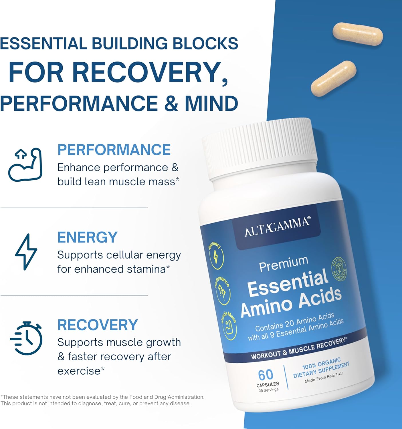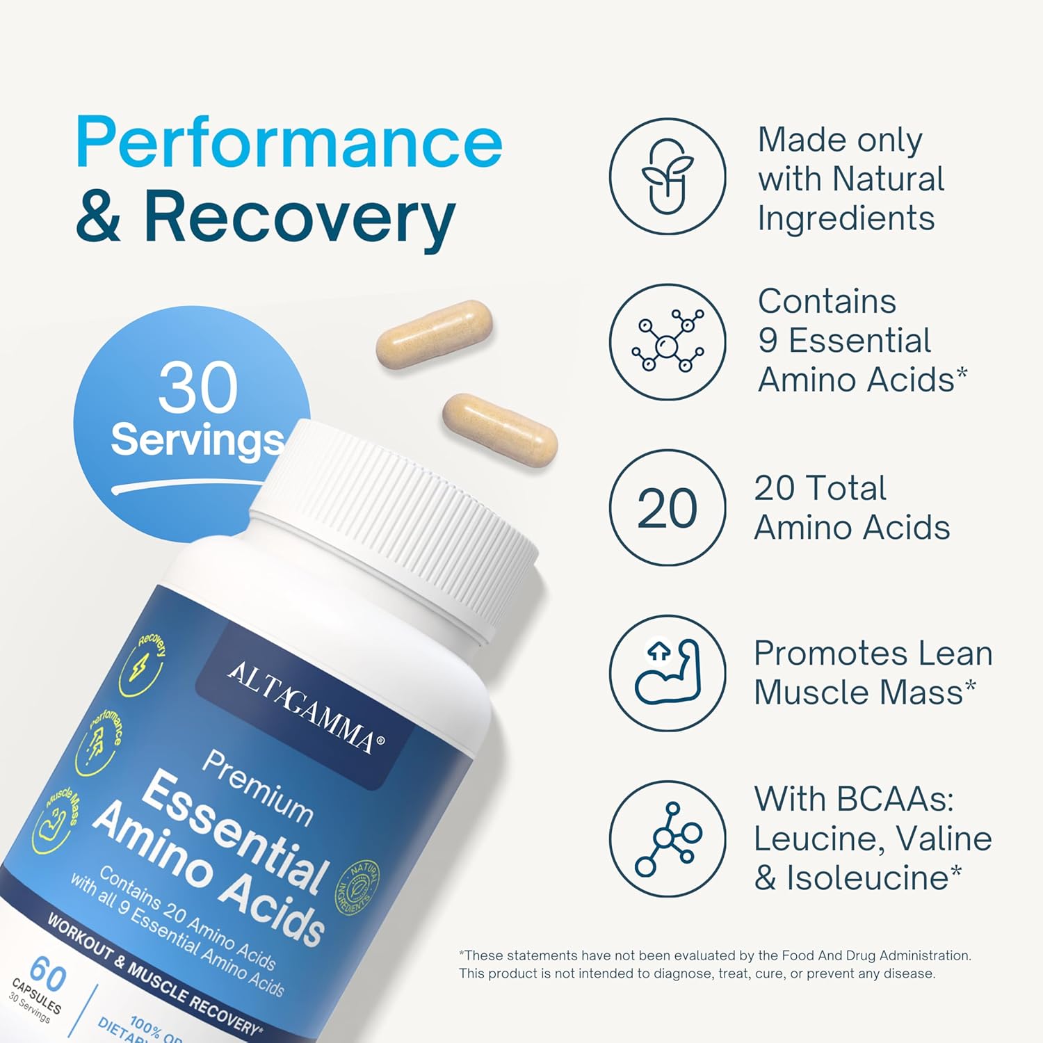 9 AMINO ACIDS SUPPLEMENT AND ALL BCAA: ALTAGAMMA amino acid supplement contains all 9 amino acids: histidine, isoleucine, leucine, l lysine, methionine, phenylalanine, threonine, tryptophan, and valine. Our advanced amino formula also delivers all three branched-chain amino acids: isoleucine, valine and leucine amino acid, along with additional amino acids like l tyrosine, l arginine, l glutamine, and more