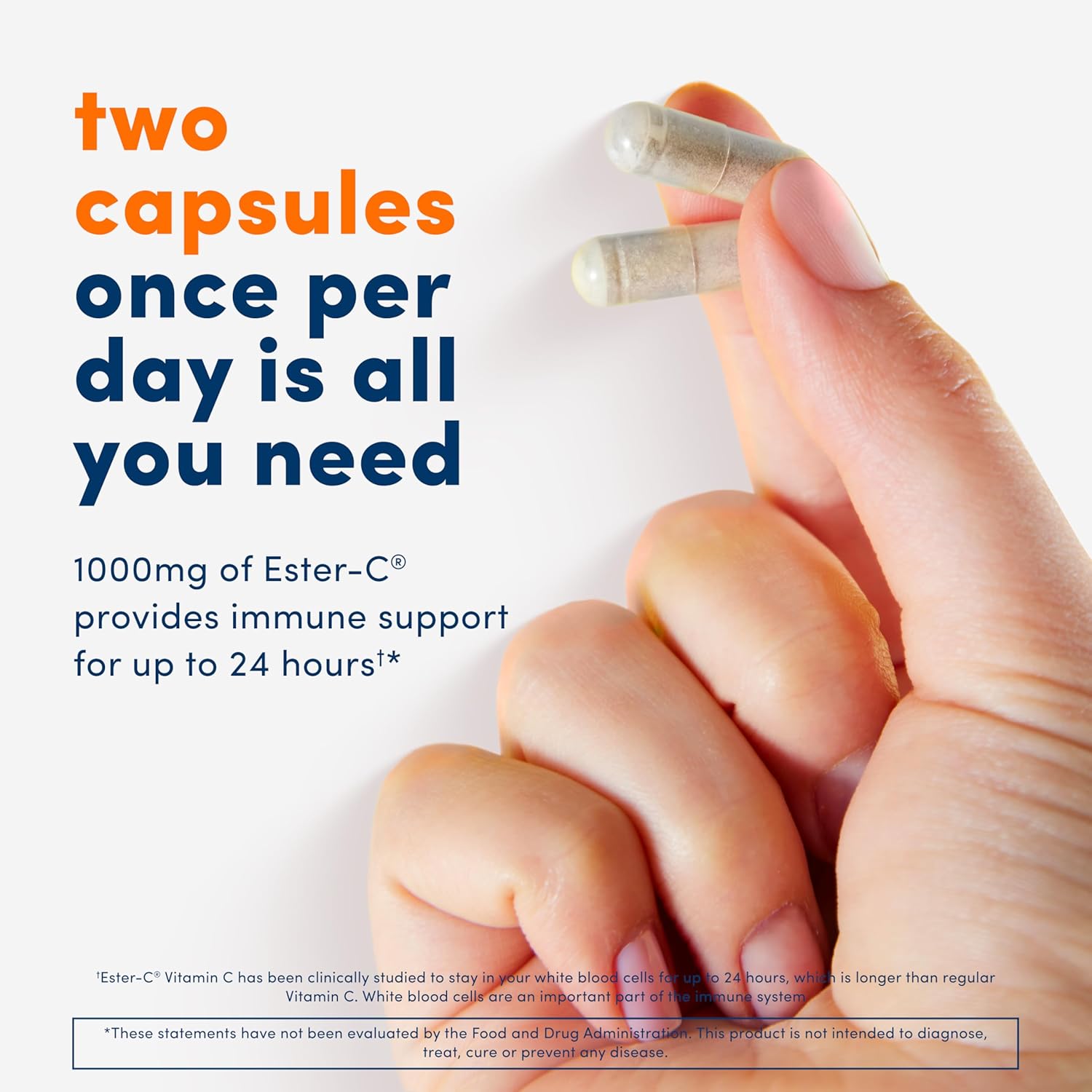 24-Hour Immune Support; Ester-C delivers 24-hour immune support, so one daily serving of 1000 mg is all you need; As a potent antioxidant, it helps fight free radicals, which can cause oxidative stress that may lead to the premature aging of cells