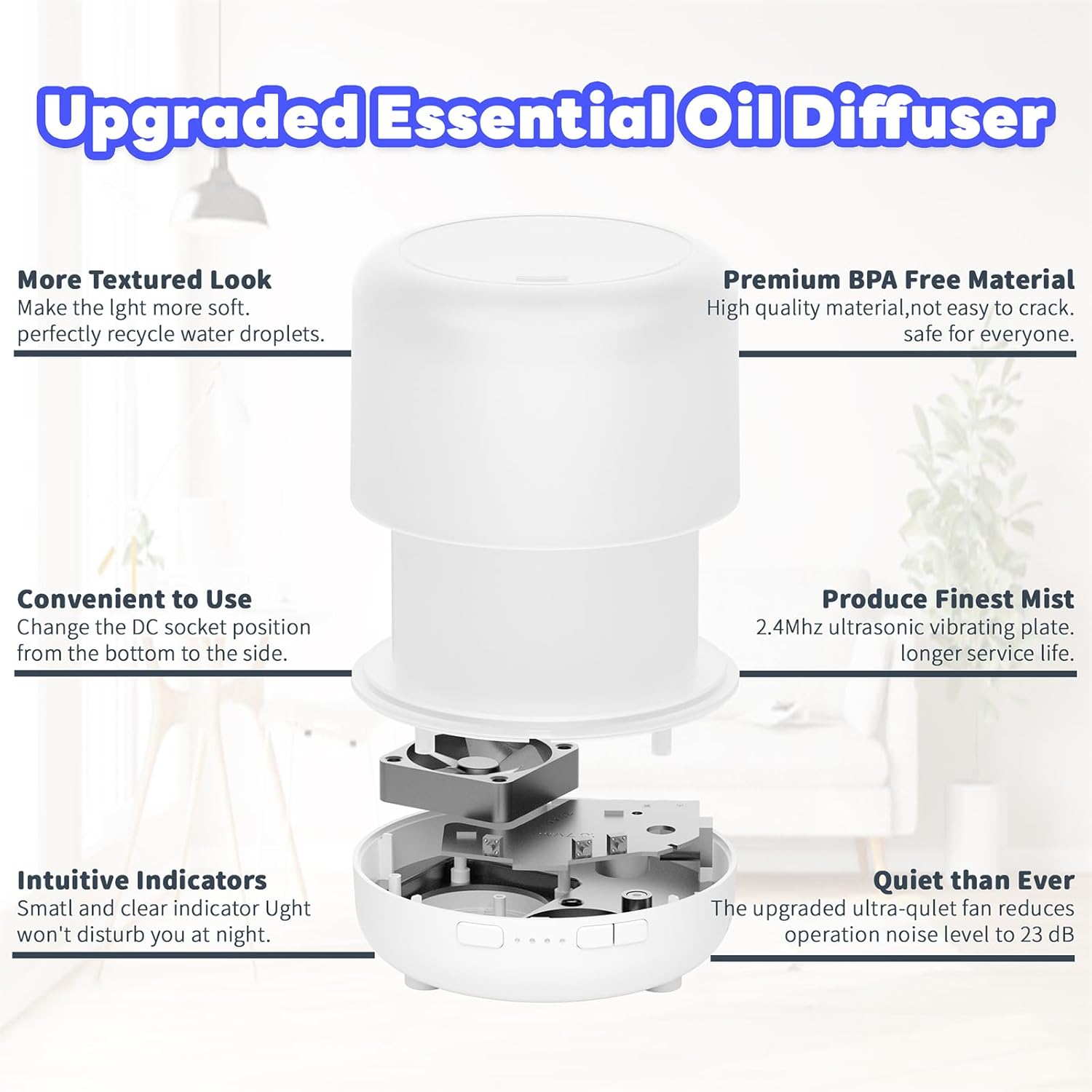 Put essential oils inside, this essential oil diffuser fills the space with a lovely scent that can uplift the spirit and relieve the stress of a tense and exhausting day, perfect for burying stubborn smoking and pet odors and helping you get a peaceful night's sleep with the aromatic scent.