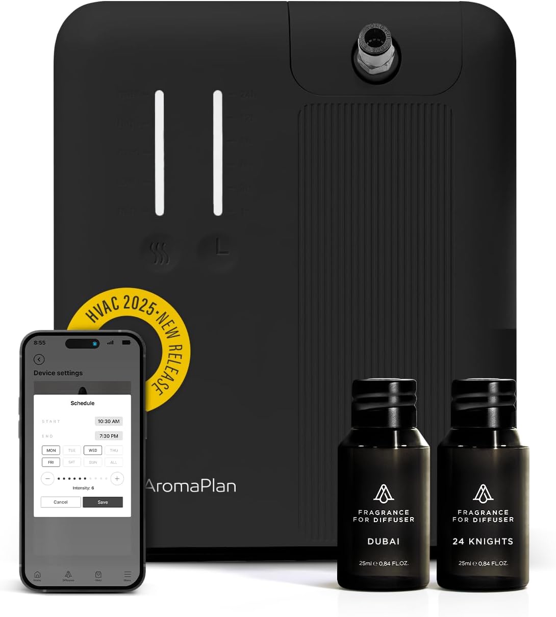 2025 NEW RELEASE SCENT DIFFUSER, HVAC CONNECTIVITY & APP CONTROL -The AromaPlan DAP PRO 2025 features a 300ml refillable reservoir and covers up to 2,000 sq ft using cold-air, waterless diffusion technology. Control it effortlessly via the exclusive mobile app, compatible with Bluetooth Technology (Bluetooth is a registered trademark of Bluetooth SIG.), 5 scheduling options, and 10 adjustable fragrance intensity levels. Designed for maximum versatility, it can be wall-mounted, used as a portable floor unit, or integrated directly with your HVAC system for whole-home scent distribution.