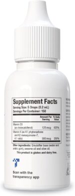 Vitamin D3 (as cholecalciferol), Vitamin K (as K1 phytonadione and, K2 menaquinone-7, 4:1 ratio), Emulsifier base (water and arabic gum), sesame oil and olive oil.
