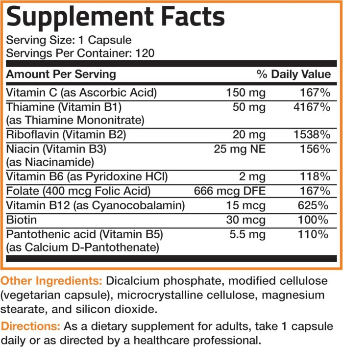 Contains All B Vitamins + C: Bronson’s B-Complex formula contains Vitamin B1, B2, B3, B6, Folic Acid, B12, Biotin, and Pantothenic Acid plus Vitamin C all within one vegetarian capsule.