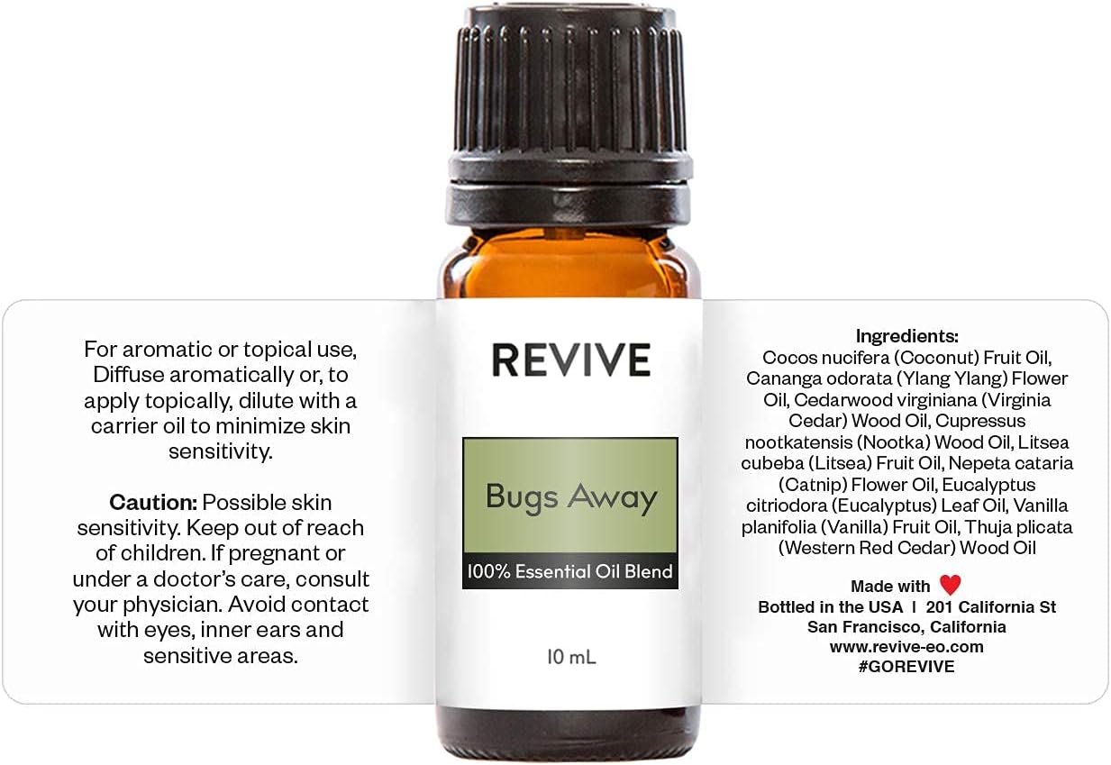 REVIVE Bugs Away is a proprietary blend of Fractionated Coconut Oil, Ylang Ylang Flower, Nootka Wood, Cedarwood Wood, Catnip Plant, Lemon Eucalyptus Leaf, Litsea Fruit, Vanilla Bean Absolute, and Arborvitae Wood essential oils.