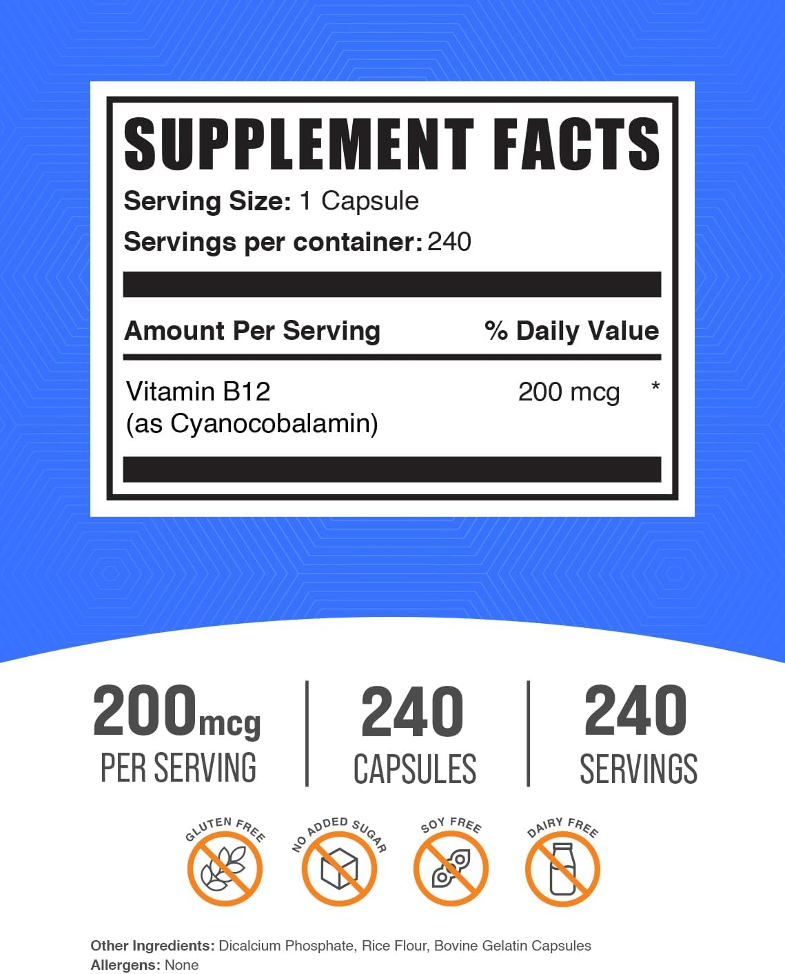 Easy-to-Integrate Nutritional Support: Our B12 Vitamin capsules, in Cyanocobalamin 200mcg, are designed with your convenience in mind, offering easy-to-swallow capsules that can seamlessly become part of your existing health regimen. Enhance your nutritional intake by taking the recommended dose alongside your first meal of the day.