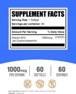 Foundational Elements for Wellness: Vitamin B12 1000 mcg softgels, in Cyanocobalamin form, are the cornerstones of health, playing critical roles in various bodily functions from heart support to overall health. Ensure your body has the right building blocks for vitality.