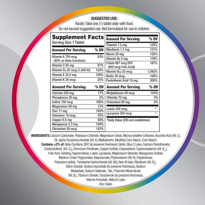 Multivitamin for women and men contain B-Vitamins and lycopene to help promote heart health, and Vitamins C and E, and zinc to help support immune health, Vitamin D to support bone health and muscle function (1, 2)