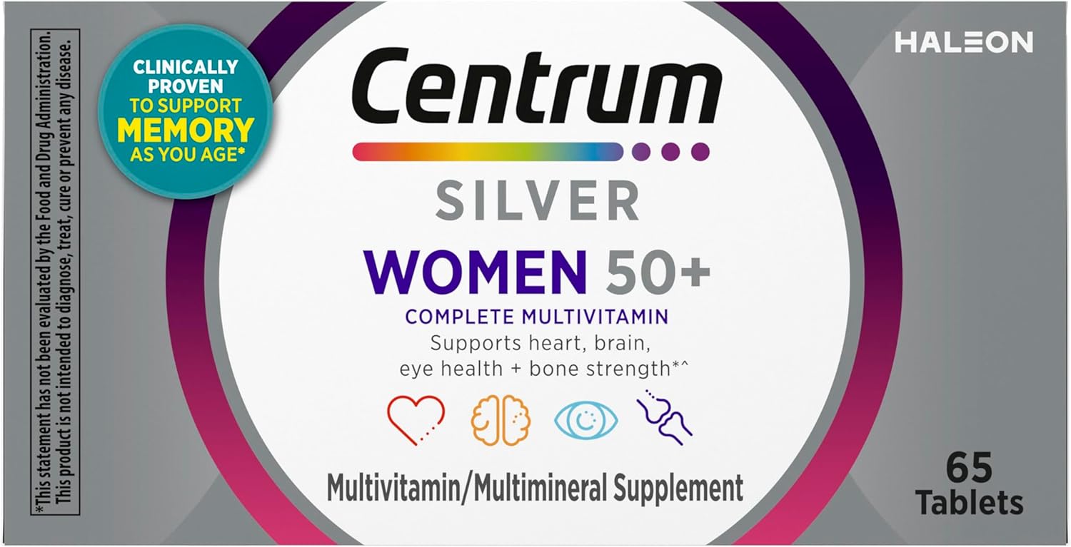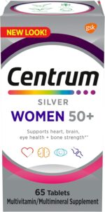 One 65 count bottle of Centrum Silver Women’s Multivitamin for Women 50 Plus, Multivitamin/Multimineral Supplement with Vitamin D3, B Vitamins, Calcium and Antioxidant Vitamins C, E, and Beta-Carotene, and Zinc
