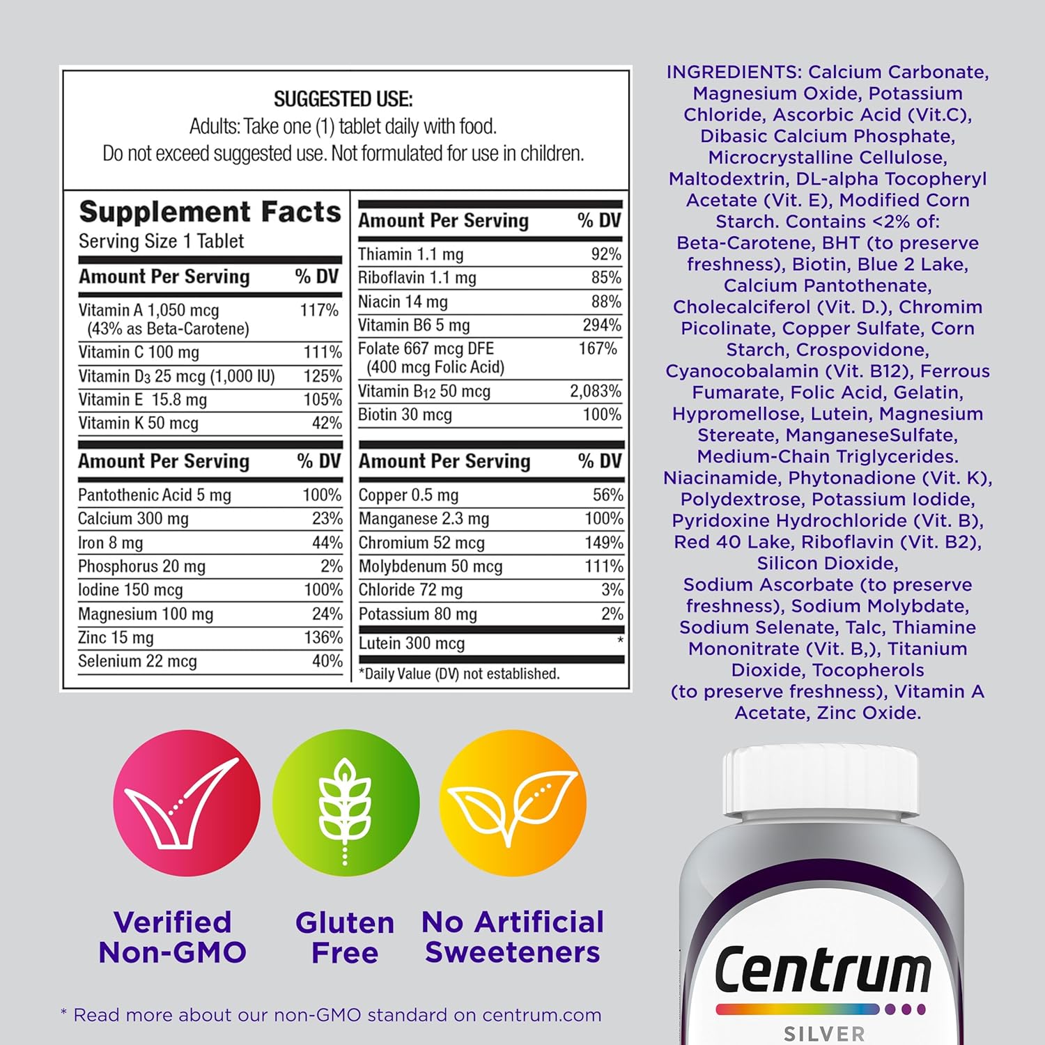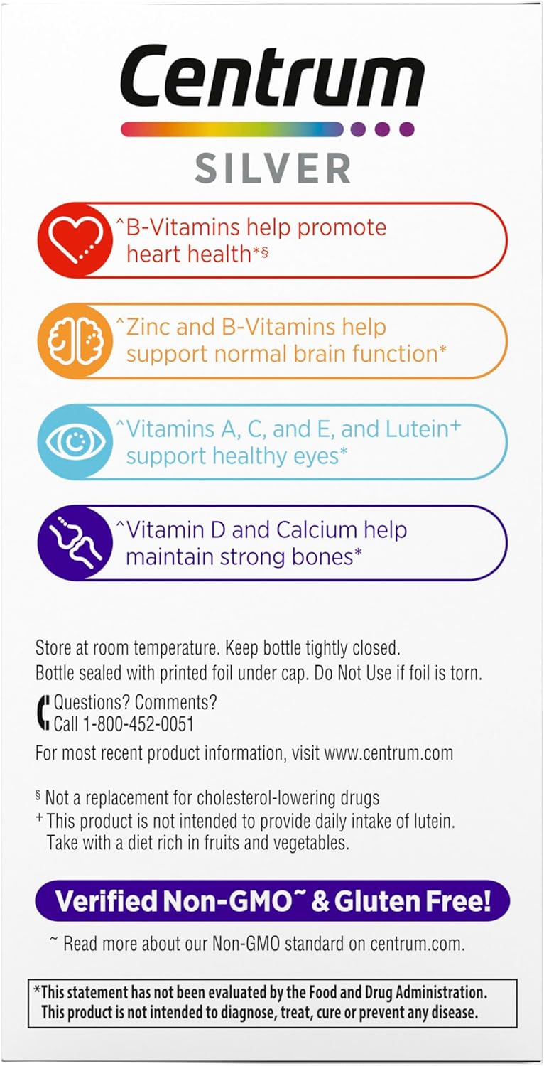 Centrum Silver Women’s Multivitamin for Women 50 Plus brings you a tailored multivitamin/multimineral supplement that contains micronutrients to help support full body wellness (1). This women’s vitamin with iron contains essential nutrients, including vitamin D and calcium to support strong bones and B Vitamins to help promote heart health (1, 2). This multivitamin for women over 50 also contains zinc and B Vitamins to help support normal brain function and Vitamins A, C, and E for eye health (1, 2). Key micronutrients in these multivitamins with zinc supplements help fill in nutritional gaps to promote overall wellness and vitality (1). These women’s vitamins are verified Non-GMO (3) and gluten free. This women’s multivitamin with iron features a smooth coating that makes it easy to swallow. Simply take one multivitamin daily to provide your body with essential vitamins and minerals. Centrum Silver is the number 1 Doctor recommended multivitamin brand now shown to support memory and cognition in older adults (1).* * IQVIA: Claim substantiation Validation Statement. July 2023. IQVIA, using the ProVoice Survey, recorded the product recommended most often within the Adult Multivitamins category by physicians and pharmacists in the United States. A statistically significant majority of the panel of physicians and pharmacists responded that Centrum is the product they endorse most.(1) These statements have not been evaluated by the Food and Drug Administration. This product is not intended to diagnose, treat, cure or prevent any disease.(2) Not a replacement for cholesterol-lowering drugs (1) (3) Read more about our Non-GMO standard on Centrum’s official website.