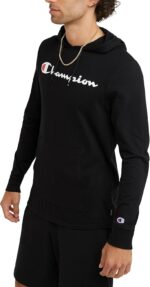 When the weather warms up and it’s time to pack away your heavy fleece hoodie, reach for Champion’s mid-weight jersey hoodie, which has all the style without the weight of fleece. This cotton jersey knit makes the perfect season-spanning layer, for a cool morning run, atop a tee with your jeans, even on the beach. Keeping it in your gym bag, your car, or take it along in your weekend tote where its versatility will serve you well. With classic hoodie styling, this cotton pullover has a drawstring hood, long sleeves with ribbed cuffs, and the essential kangaroo pocket. The straight sewn hem gives you plenty of room to move. Best of all, this jersey hoodie boldly displays the iconic Champion logo, with the “C” appliquĂ©d on the left wrist. There are endless ways in which you’ll appreciate the ease of this hoodie-style cotton jersey pullover for men.