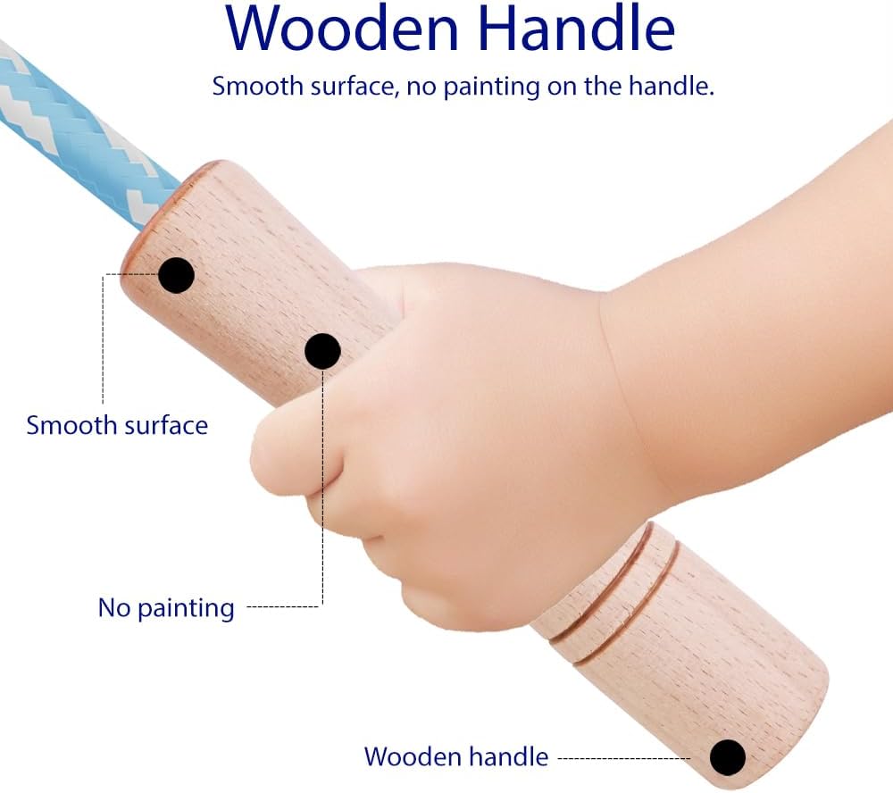 High-Quality & Safe Design – Crafted with non-toxic, odorless wooden handles, the smooth, 3.9-inch grips are designed to fit comfortably in kids’ hands. The lightweight cotton-braided rope is durable, tangle-free, and gentle—leaving no harsh whip marks.