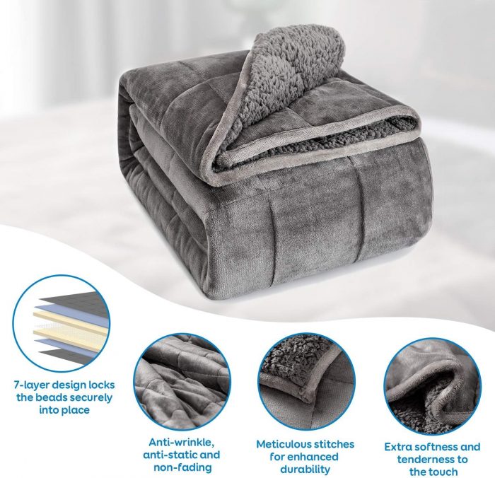 Industry-Leading Craftsmanship: Weighted blanket applies safe and natural ceramic beads filling in a 7-layer design. Wrapped with extra fabric layer and non-glue polyester fibers, these beads are securely locked in the smaller compartments for even distribution in case of any leakage or rustling