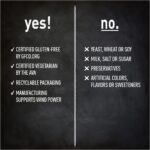 CONTAINS NO GMOs! Also NO – Yeast – Wheat – Soy – Milk – Salt – Sugar – Preservatives – Artificial Colors – Artificial Flavors – Artificial Sweeteners.
