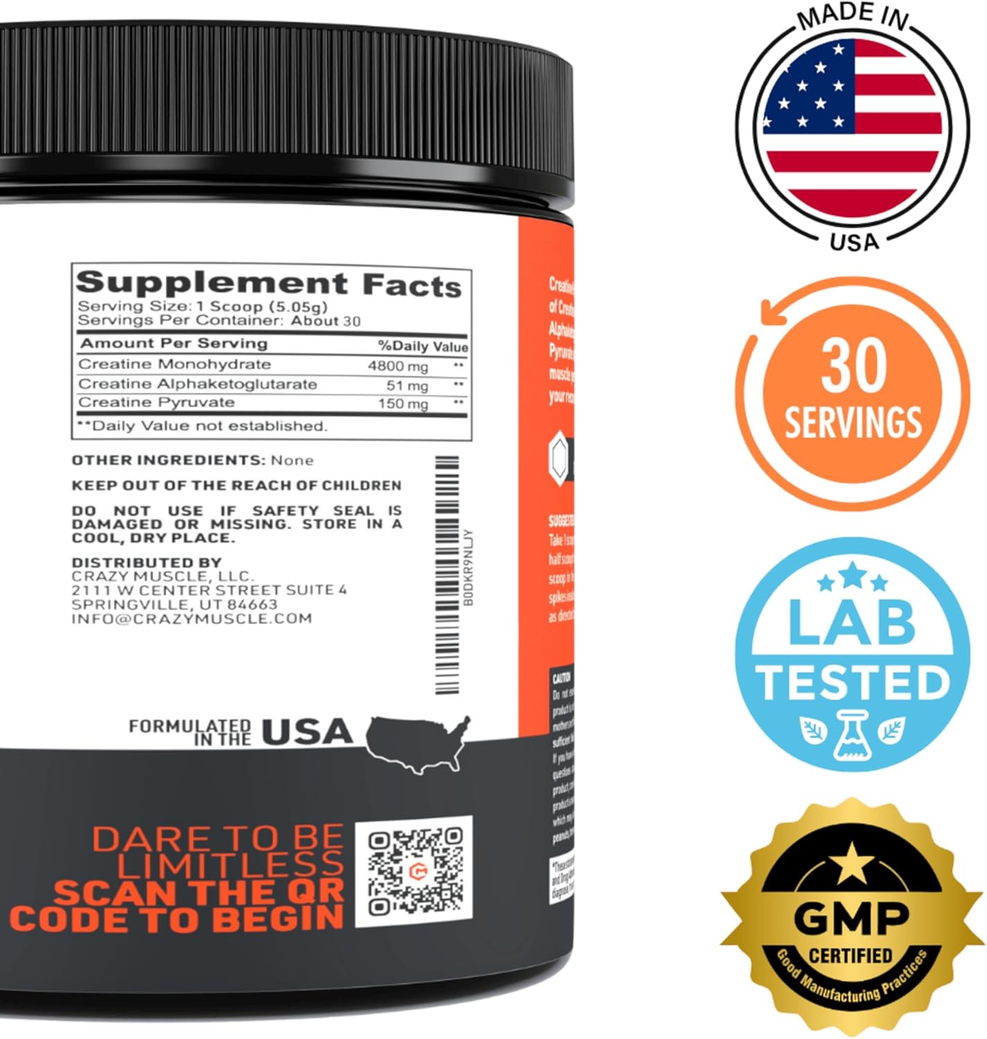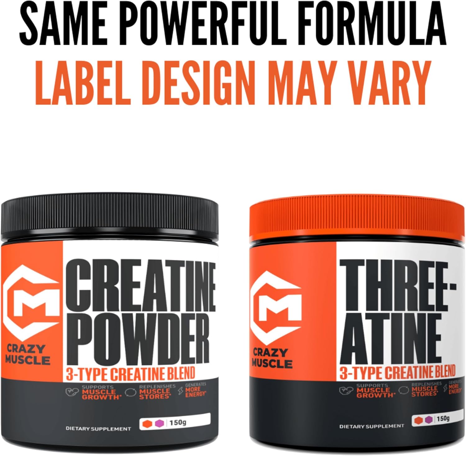 Crazy Muscle Creatine Monohydrate Powder, 5000mg Premium 3X ThreeAtine Pre Workout Mass Gainer, High Absorption Easy to Take Powder Optimum Performance for Men & Women, 30 Servings