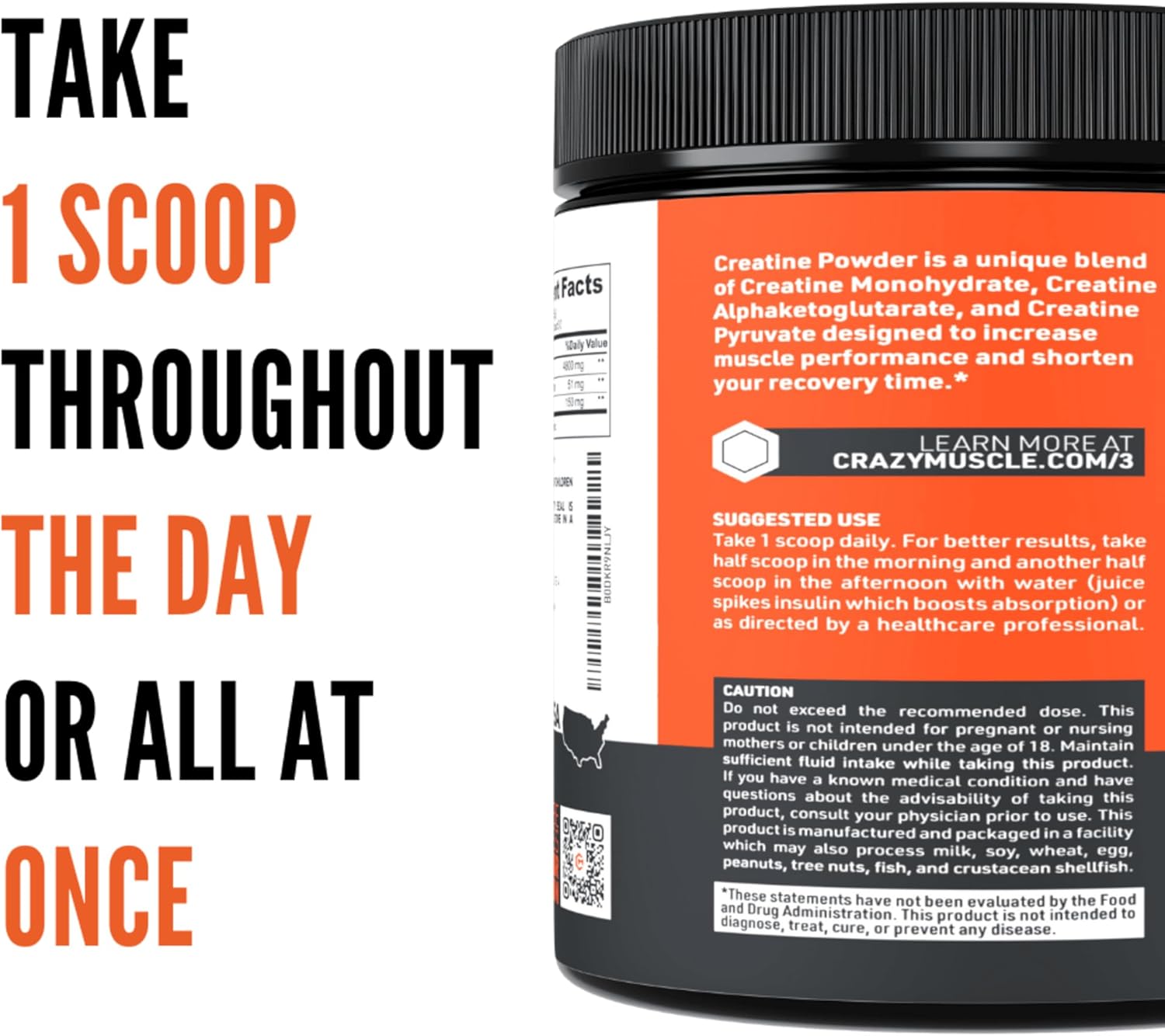 Elevate your workout with Crazy Muscle’s Three-atine Creatine Powder, a unique 3-in-1 creatine blend. Designed to support your fitness journey, not intended to treat or prevent any disease.