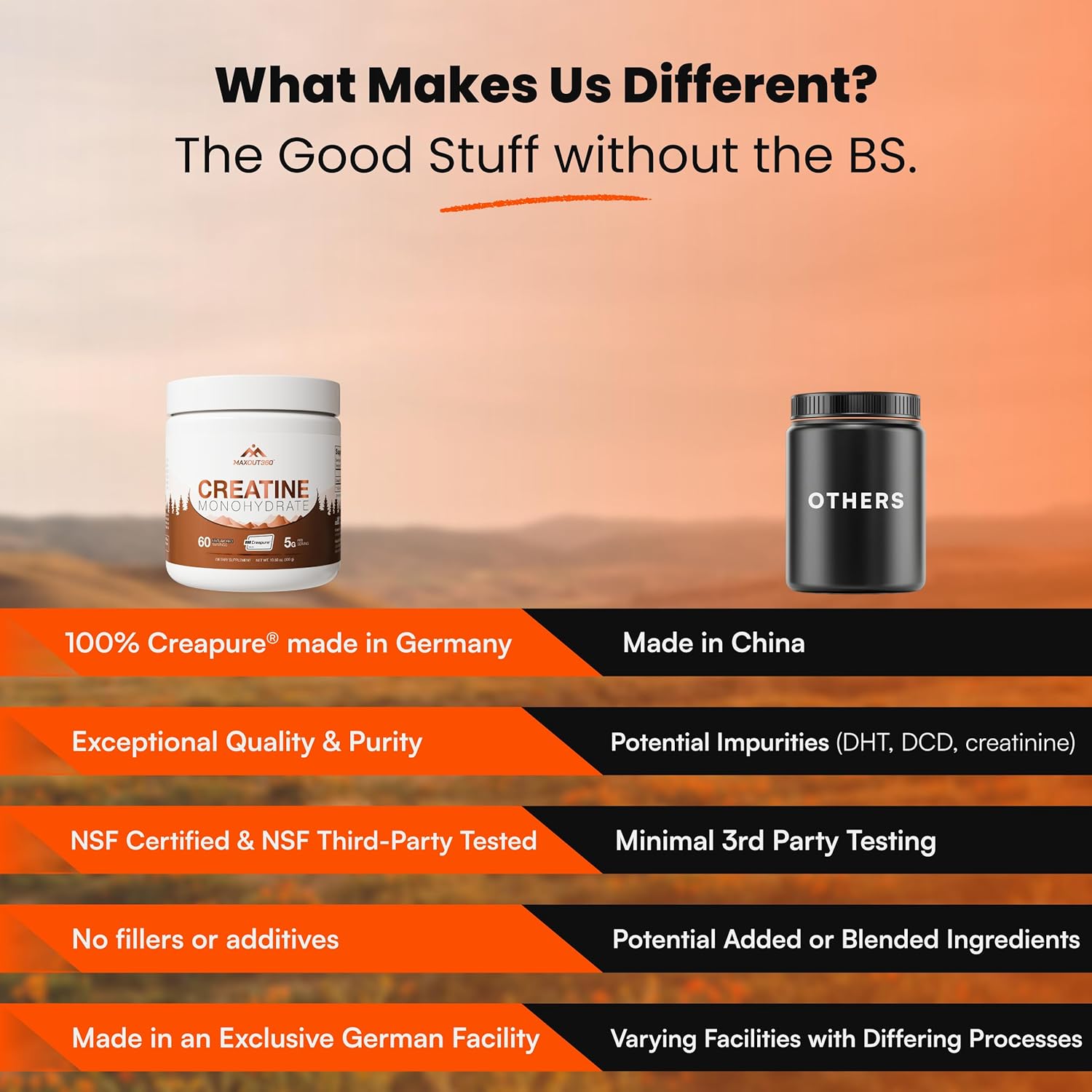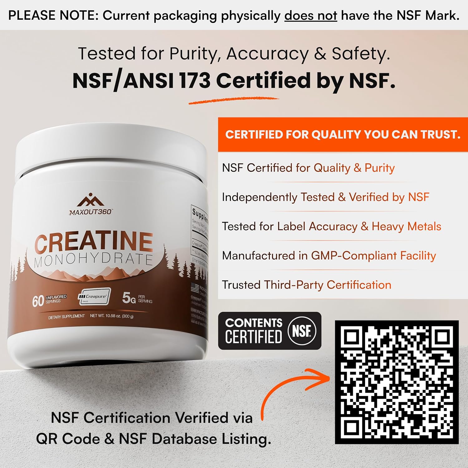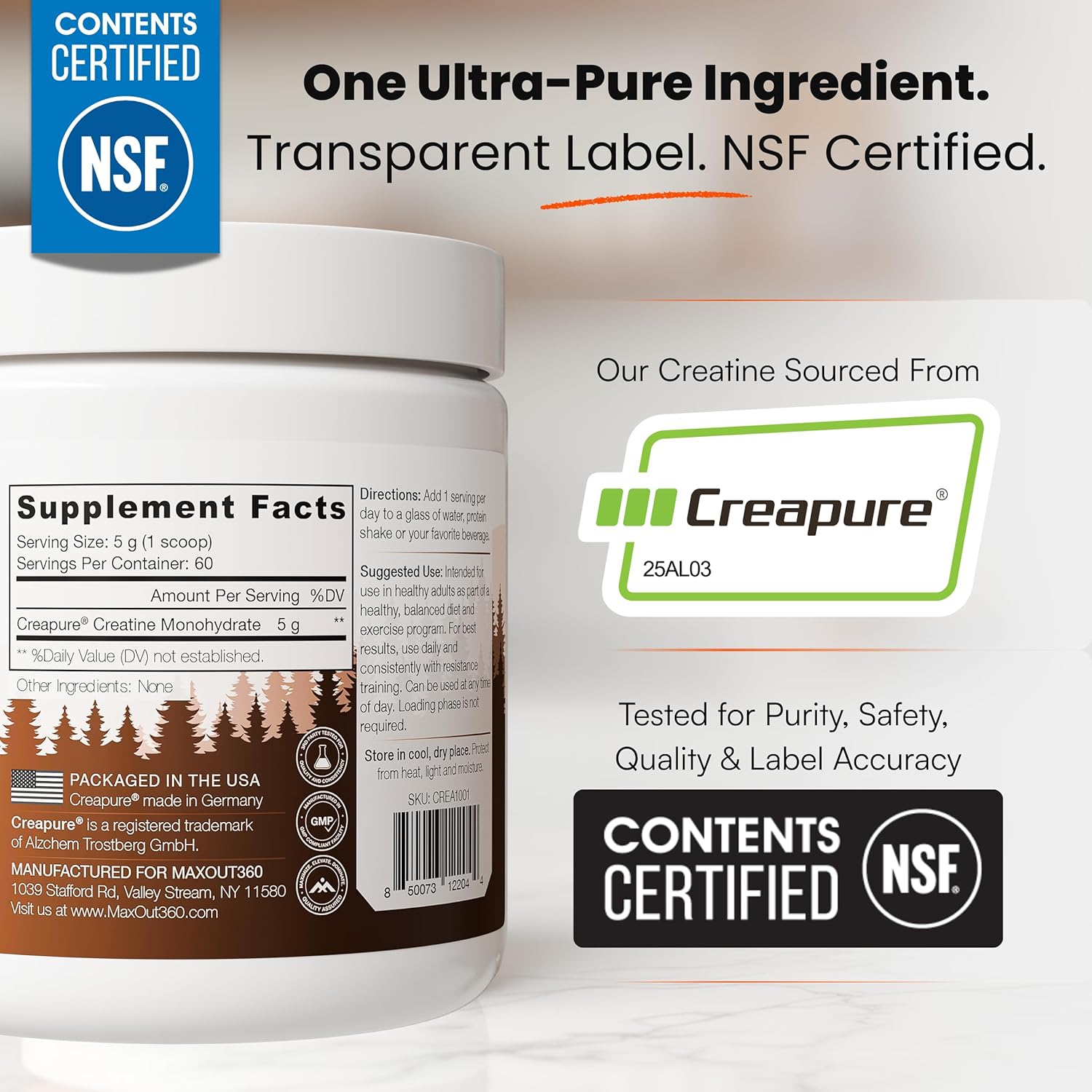 THIRD-PARTY TESTED & NSF CERTIFIED CREATINE: Creapure creatine monohydrate powder is unflavored, vegan, and non-GMO. It is independently tested for quality and label accuracy. Our german creatine is also NSF/ANSI 173 Dietary Supplement Certified by NSF ensuring high manufacturing and quality standards across our creatine nutritional supplements product line.