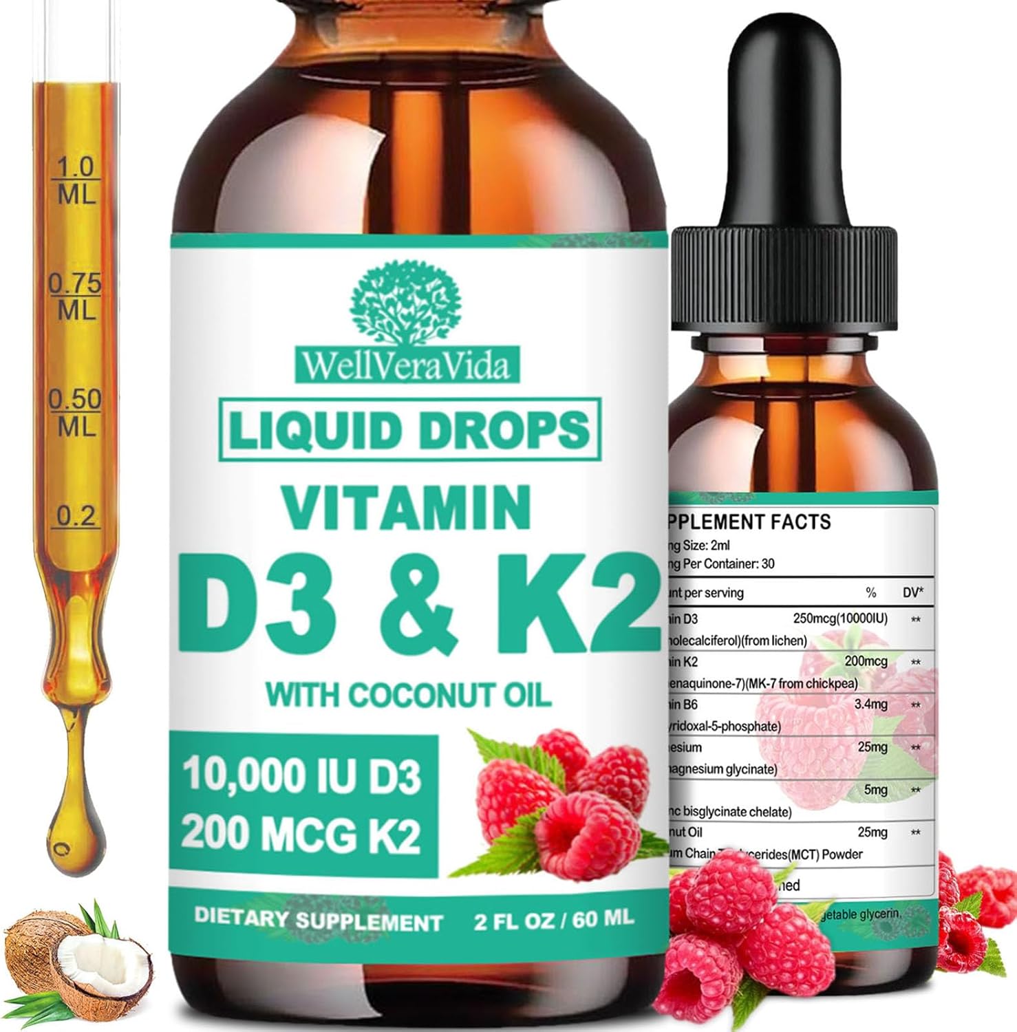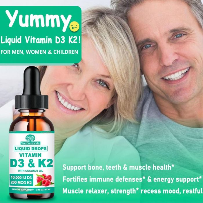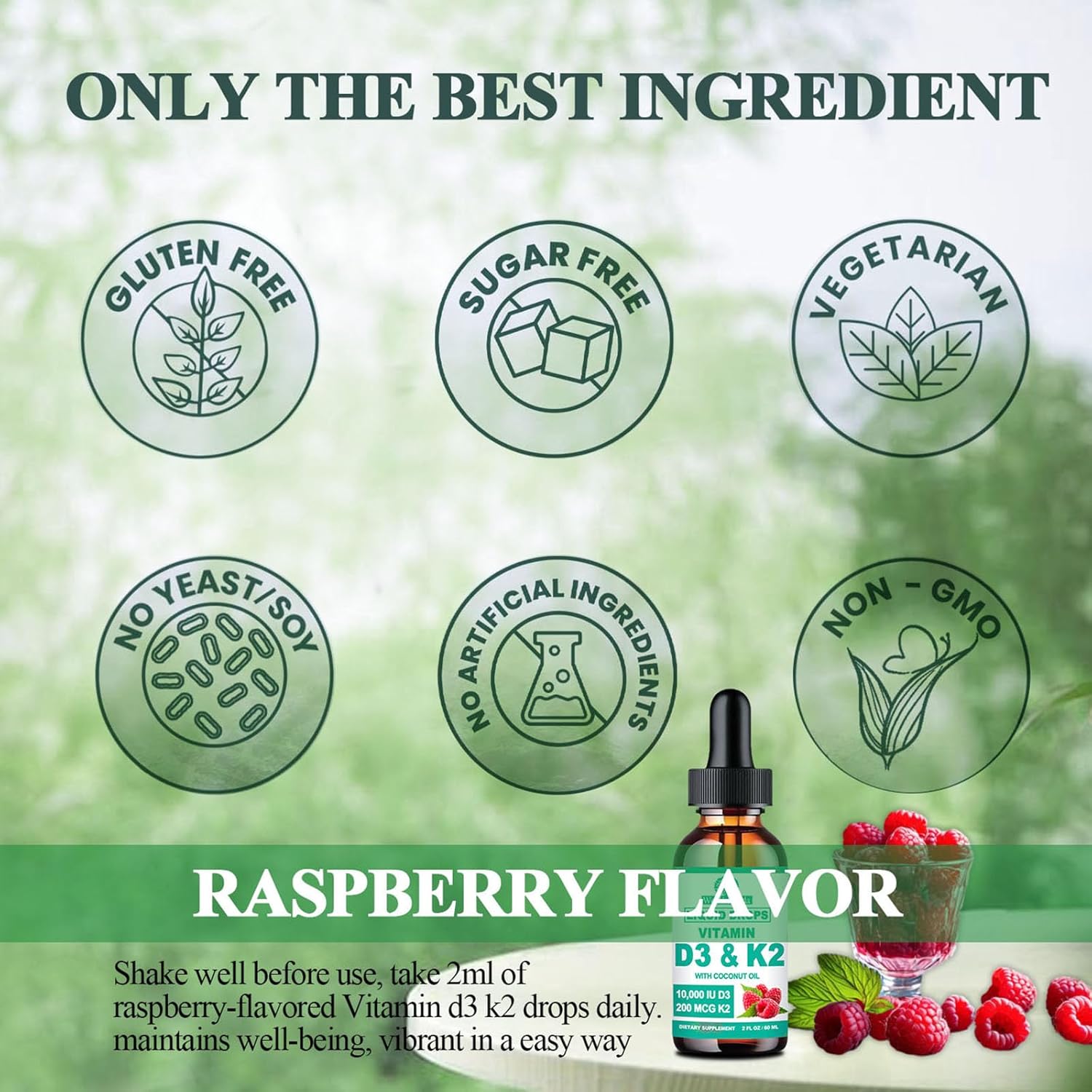 EASY TO SWALLOW & EASY TO ABSORBED IRON DROPS: Not a fan of swallowing large pills? Our k2 d3 vitamin supplement in liquid forms with raspberry flavor absorbed 5X faster and stronger by your body than vitamin d3 k2 pill, d3 k2 capsules, vitamin d3 k2 sofegels, and giving it an excellent absorption rate of 98%, higher than other forms. Moreover, it’s simple way to take vitamin to your daily routines, just take 2 full droppers with coffee, water,drink or salad…Better promoted the regular and comfortable elimination of body toxins