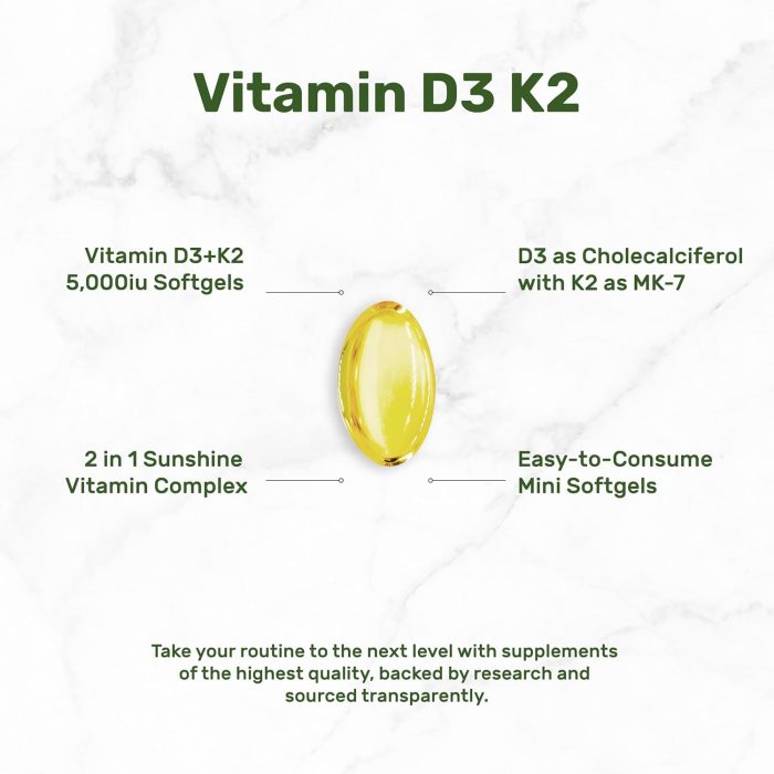 The Best Partner – Vitamin D3 with K2 (D3 K2 Vitamin 5,000iu), to get proper calcium absorption vitamin D3 helps the body to absorb calcium and vitamin K2 will direct it into bones, the perfect pair to fight vitamin D deficiency and maximize overall benefits.