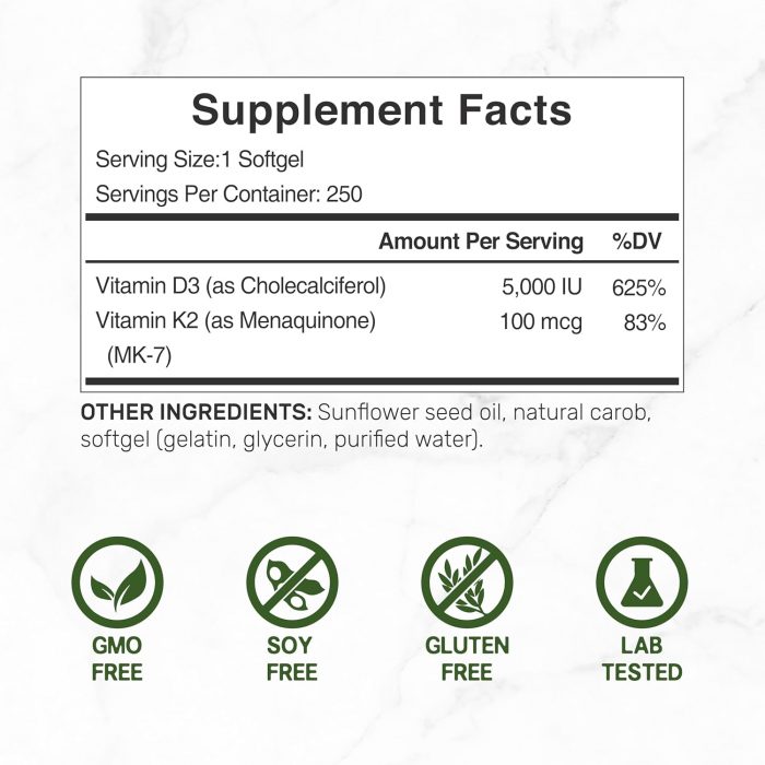 Quality Ensured – This bioavailable vitamin D3 with K2 softgel is gluten free, diary free, non-GMO, with no preservatives, no tree-nuts. no sugar, & 3rd party tested.