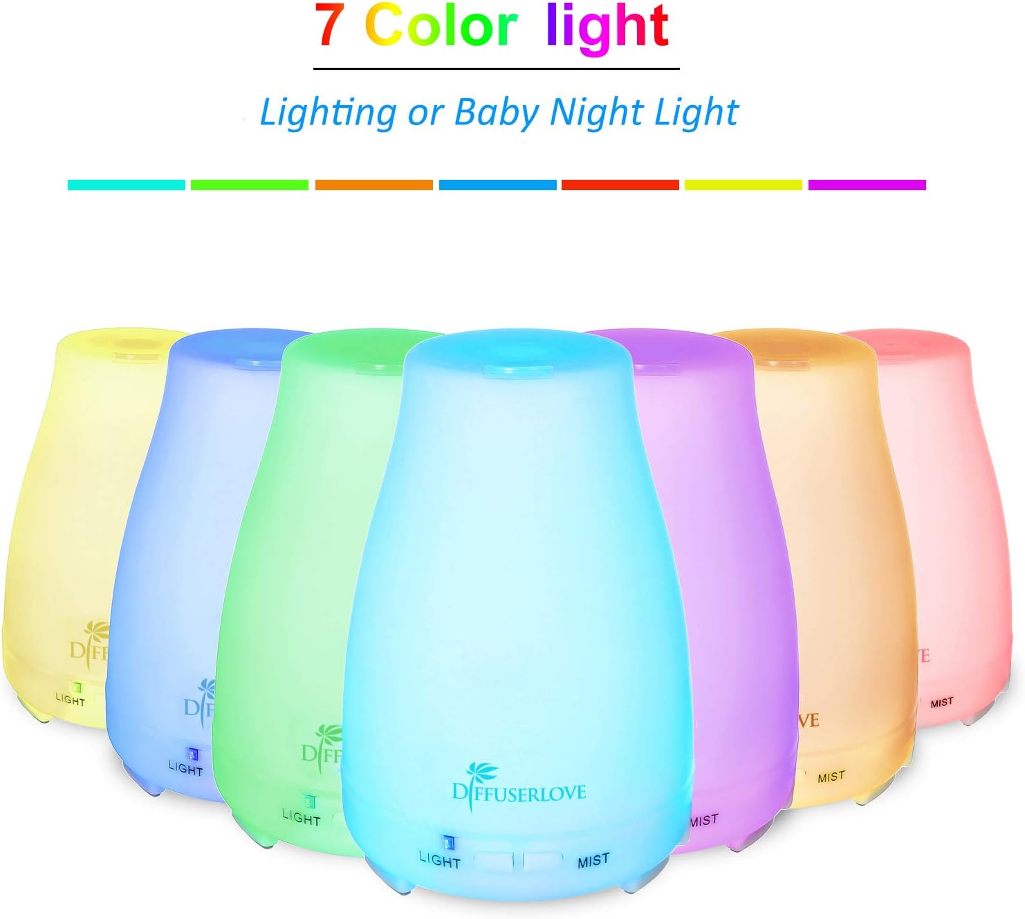 【Streamlined design of 7 LED Lights】Aromatherapy essential oil diffuser have 7 different light colors. You can choose to cycle them through or freeze on one fixed color to create a different atmosphere of interior space. It is also a beautiful night light,you can easy to click the LIGHT on and off.
