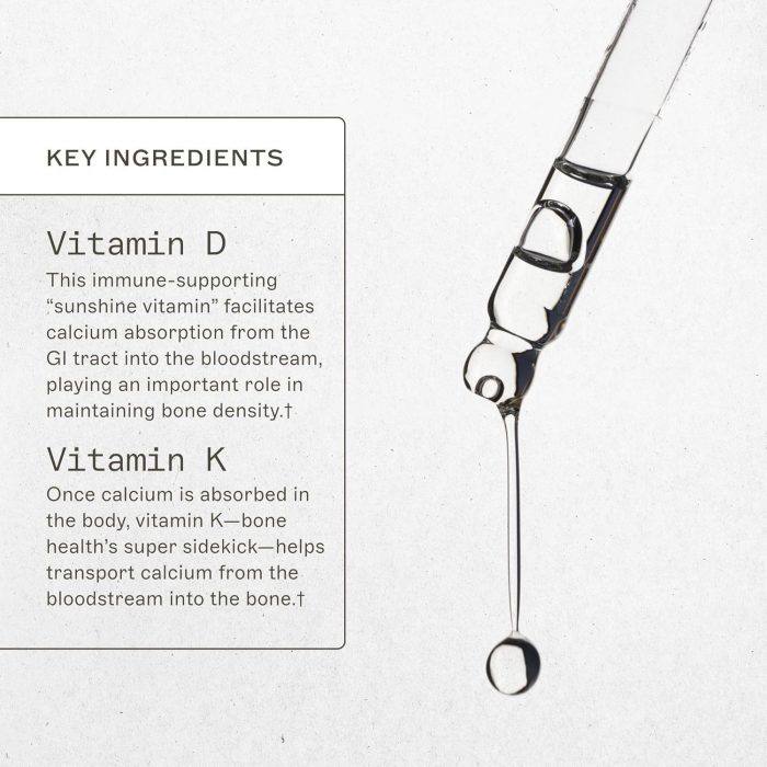 Vitamin D (as D3 Cholecalciferol) 125 mcg (5,000 IU), Vitamin K (as Vitamin K-2MK-7) 50 mcg. Other ingredients: Medium-chain triglycerides (MCT) oil (coconut).