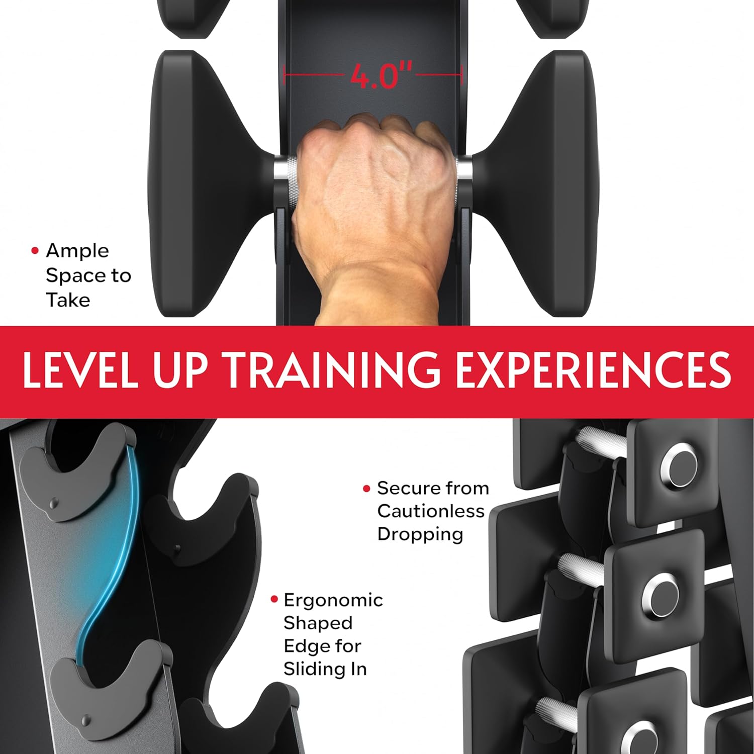 Ergonomic Semi-Round Edge: Choosing the correct rack stand is important; our curved slot corners ensure a smooth re-racking experience, allowing you to effortlessly slide in weights; no more pinching in the fingers! Your hands deserve the best care