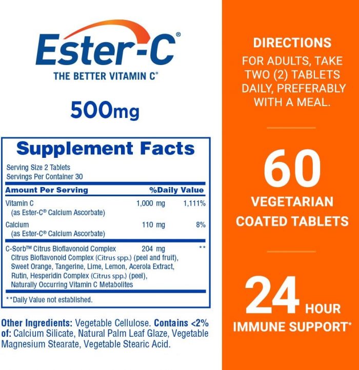 For adults, take two Ester-C 500 mg Vitamin C immune support supplements once daily, preferably with a meal (1)