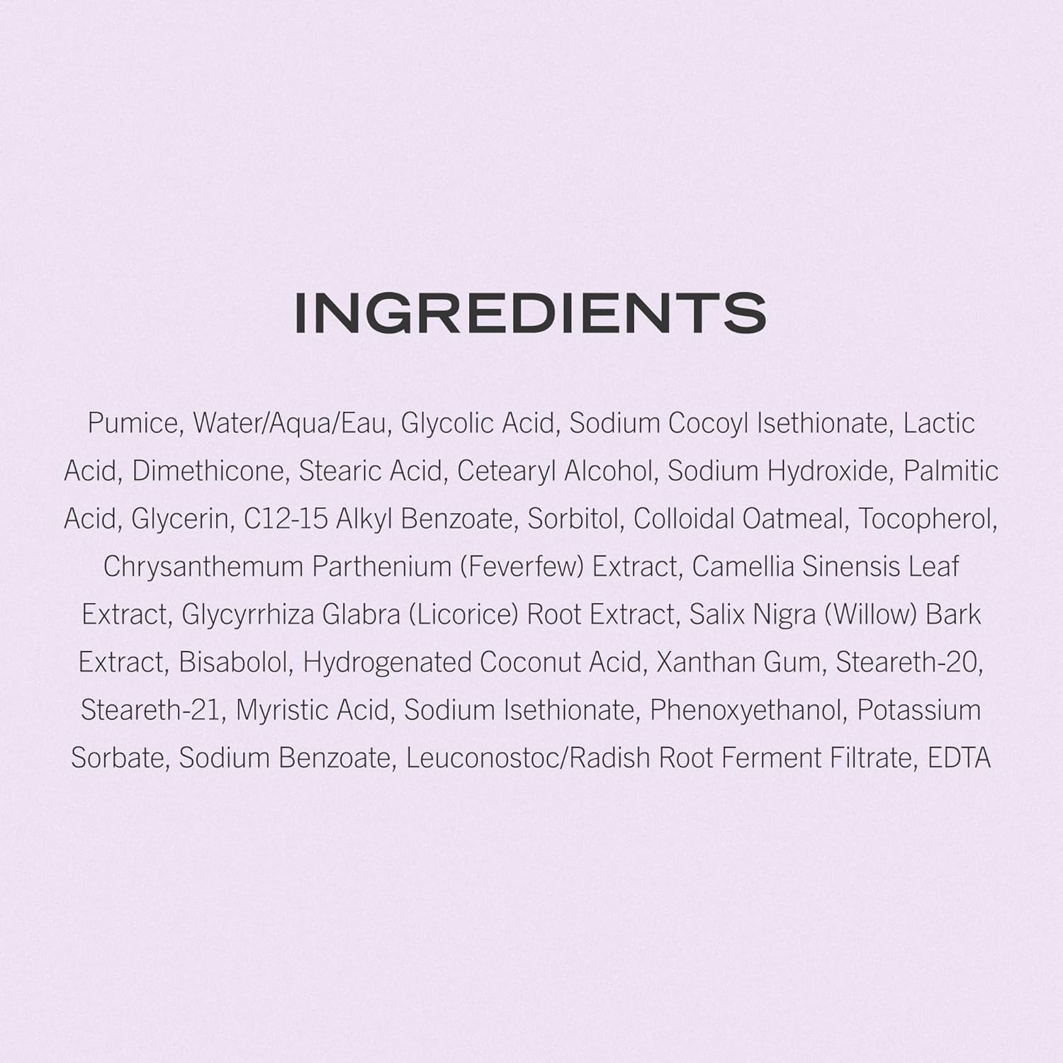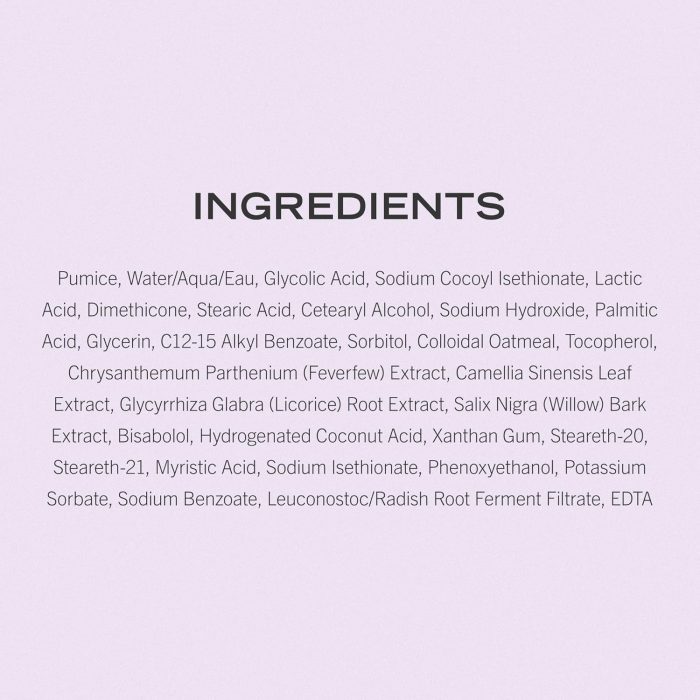 Pumice, Water/Aqua/Eau, Glycolic Acid, Sodium Cocoyl Isethionate, Lactic Acid, Dimethicone, Stearic Acid, Cetearyl Alcohol, Sodium Hydroxide, Palmitic Acid, Glycerin, C12-15 Alkyl Benzoate, Sorbitol, Colloidal Oatmeal, Tocopherol, Chrysanthemum Parthenium (Feverfew) Extract, Camellia Sinensis Leaf Extract, Glycyrrhiza Glabra (Licorice) Root Extract, Salix Nigra (Willow) Bark Extract, Bisabolol, Hydrogenated Coconut Acid, Xanthan Gum, Steareth-20, Steareth-21, Myristic Acid, Sodium Isethionate, Phenoxyethanol, Potassium Sorbate, Sodium Benzoate, Leuconostoc/Radish Root Ferment Filtrate, EDTA