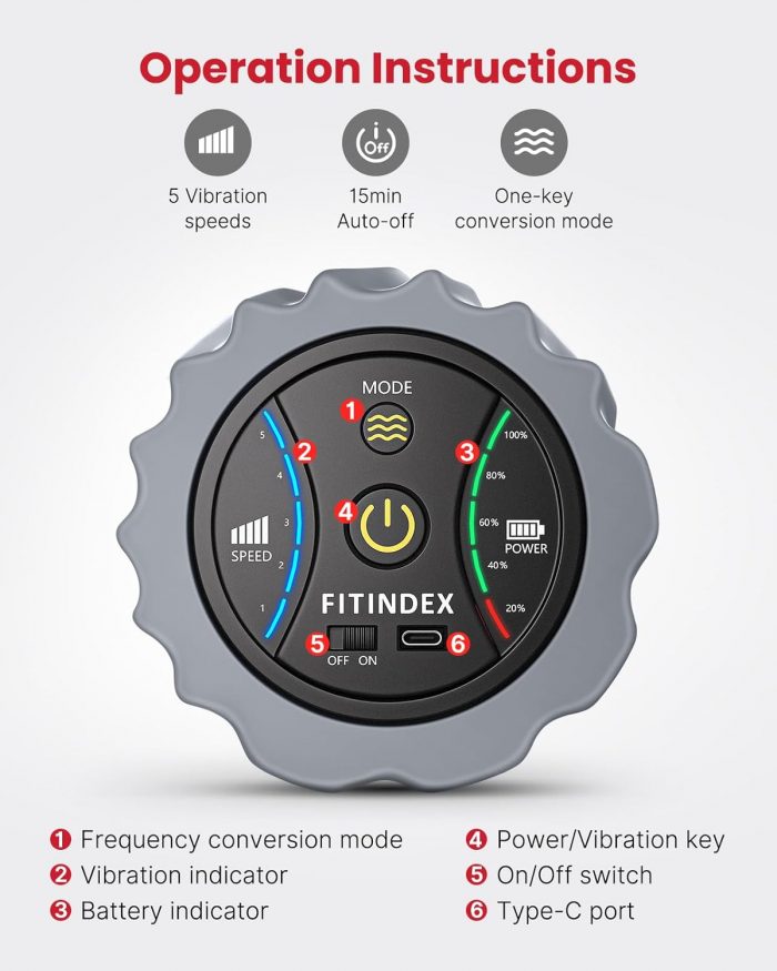 [5 Vibration Intensity] Experience tailored muscle relief with our electric foam roller’s 5 powerful vibration intensity settings, featuring frequency conversion technology. Whether you’re targeting specific muscle groups or engaging in physical therapy, adjust the speeds from 1500RPM to 3200RPM to meet your needs