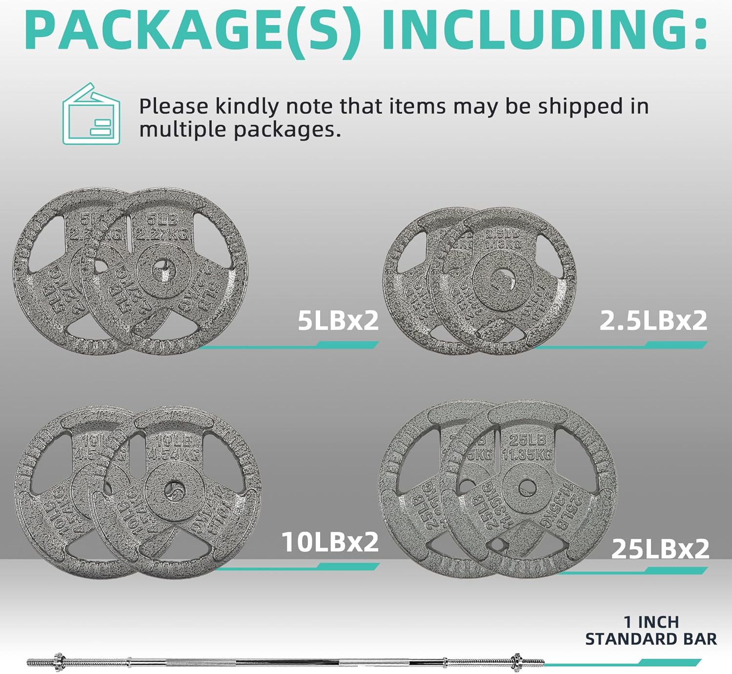 95 pounds set: 1x 5 feet Standard Barbell Bar (10 lbs) & Star Locks, 2x 2.5lbs, 2x 5lbs, 2x 10lbs, 2x 25lbs Cast Iron Plates.