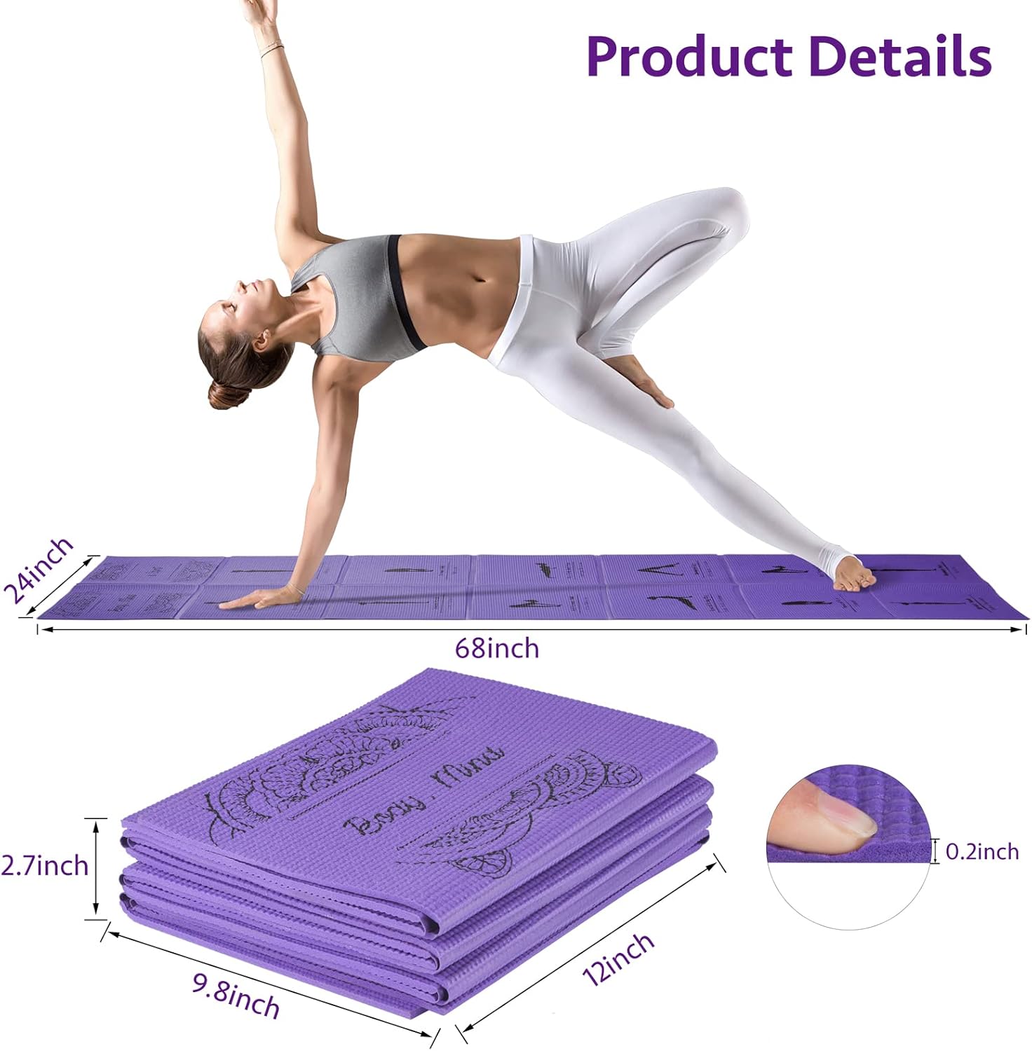 【Portable & Foldable Design】The travel yoga mat features the most cutting-edge folding design, measuring 68″x24″x1/5″ Inch when unfolded, and just 12.2″x9.84″x2.75″ Inch when folded, for easy storage and portability.