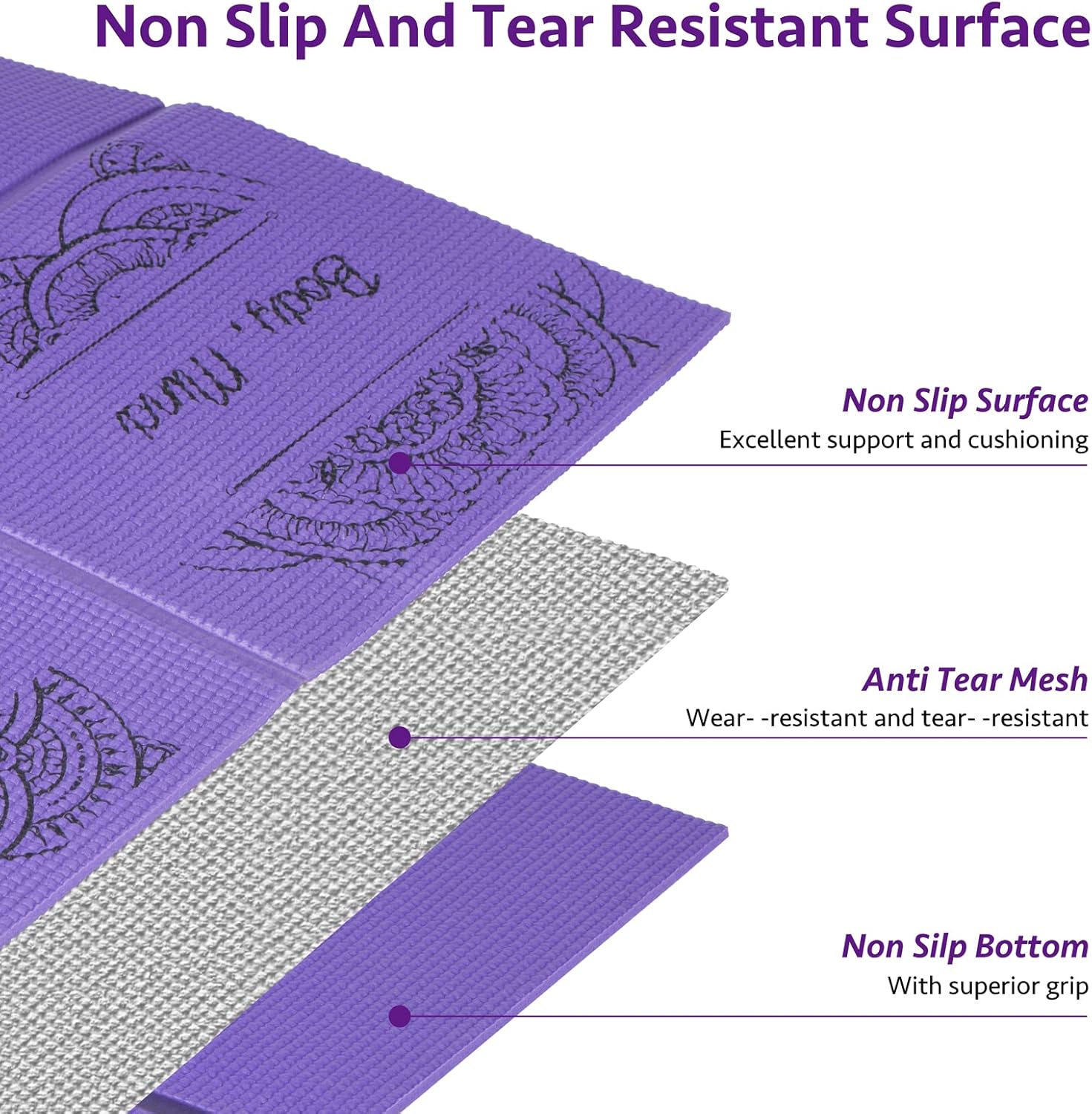 【Quality & Durable Yoga Mat】The portable yoga mat is made of high quality PVC material. High density and tear resistant material makes the yoga mat very durable.