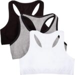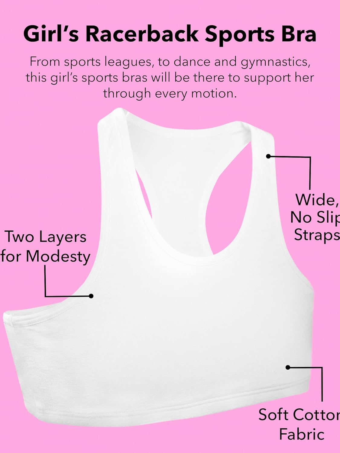 Watch her shine in the Fruit of the Loom Big Girls’ Cotton Training Bra From sports leagues to dance and gymnastics, these girl’s sports bras will be there to support her through every motion. The training sports bras are made of soft, stretch cotton fabric in an easy, pullover style. These tween sports bras for girls have a wide elastic bottom band and wider straps that gives her a snug fit to lay underneath clothing. Two ply, soft cotton fabric for modesty. These girl’s sports bras feature a scoop front and back. We know your future fashionista wants to dress herself. Fruit of the Loom Girl’s sports bra for girls comes in all of the assorted solid colors & adorable prints so she can pick a fresh look all her own.. Girls training bras 8-10, bra for girls 10-12, girls sports bra 12-14. Give the girl in your life a good start with Fruit of the Loom.