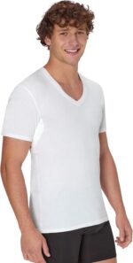 Keep your cool and your confidence intact – the Hanes Sweat Block Tee is designed to stop underarm sweat in its tracks. Innovative sweat block zones located beneath the arms capture sweat, helping you remain dry while shielding your outerwear from those embarrassing underarm stains no one likes. Crafted from quality fabric, this men’s t-shirt is both soft and breathable – making it ideal for all-day wear. Built-in moisture-wicking technology and odor control help you stay fresh and comfortable, and you’ll appreciate the Tagless® interior. This V-neck undershirt stays neatly tucked for a clean appearance under your favorite dress shirt or polo. Whether you’re powering through a stressful workday or simply hanging out, it will keep you looking sharp and feeling your best, all at a price point that won’t break your budget.