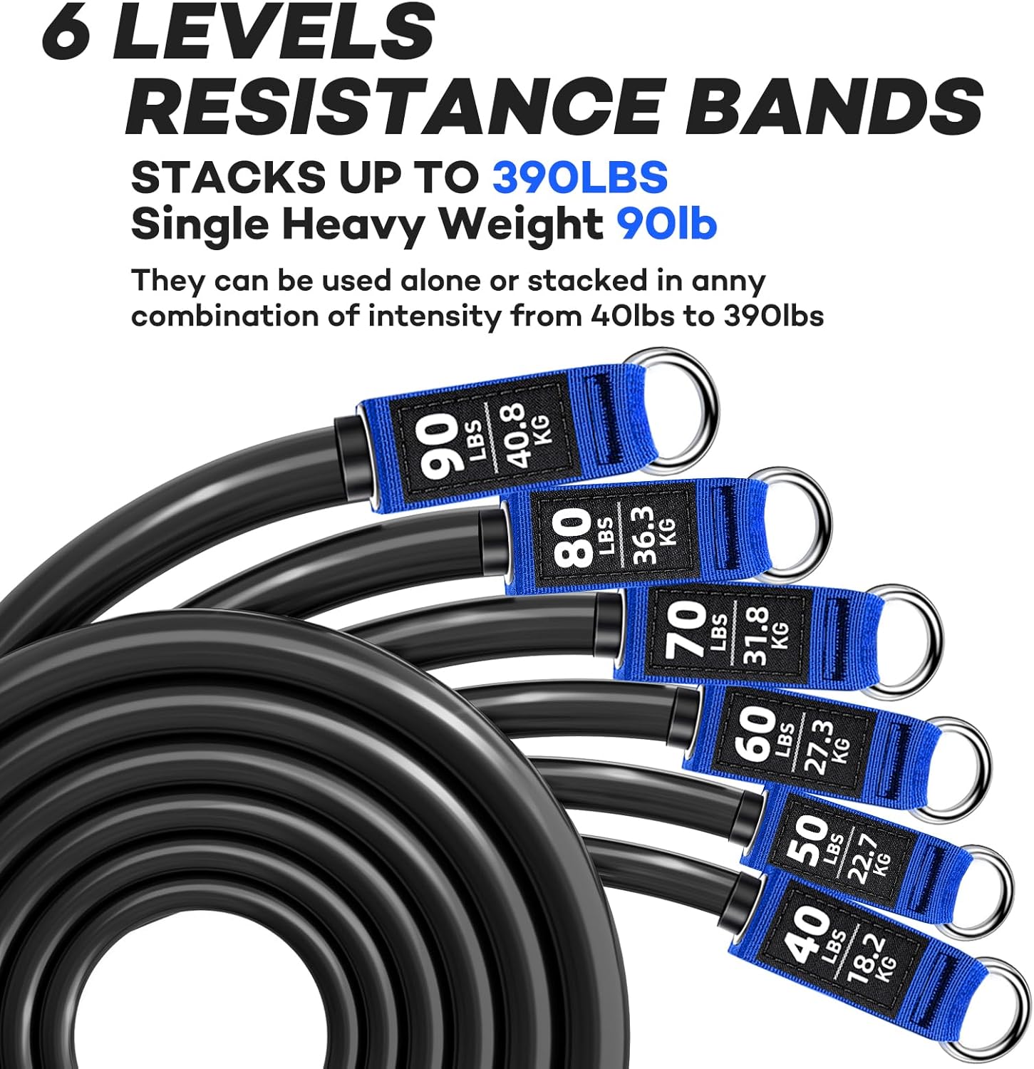 【6 Levels 390lbs Heavy Resistance Bands Set】With 6 different resistance levels(40 lbs, 50 lbs, 60 lbs, 70 lbs, 80 lbs ,90 lbs), You can freely combine our exercise bands according to your strength! Adjust 20 pounds to 310 pounds as you like, this set of high-quality resistance bands can meet your workout needs and give you a lot of room for improvement.