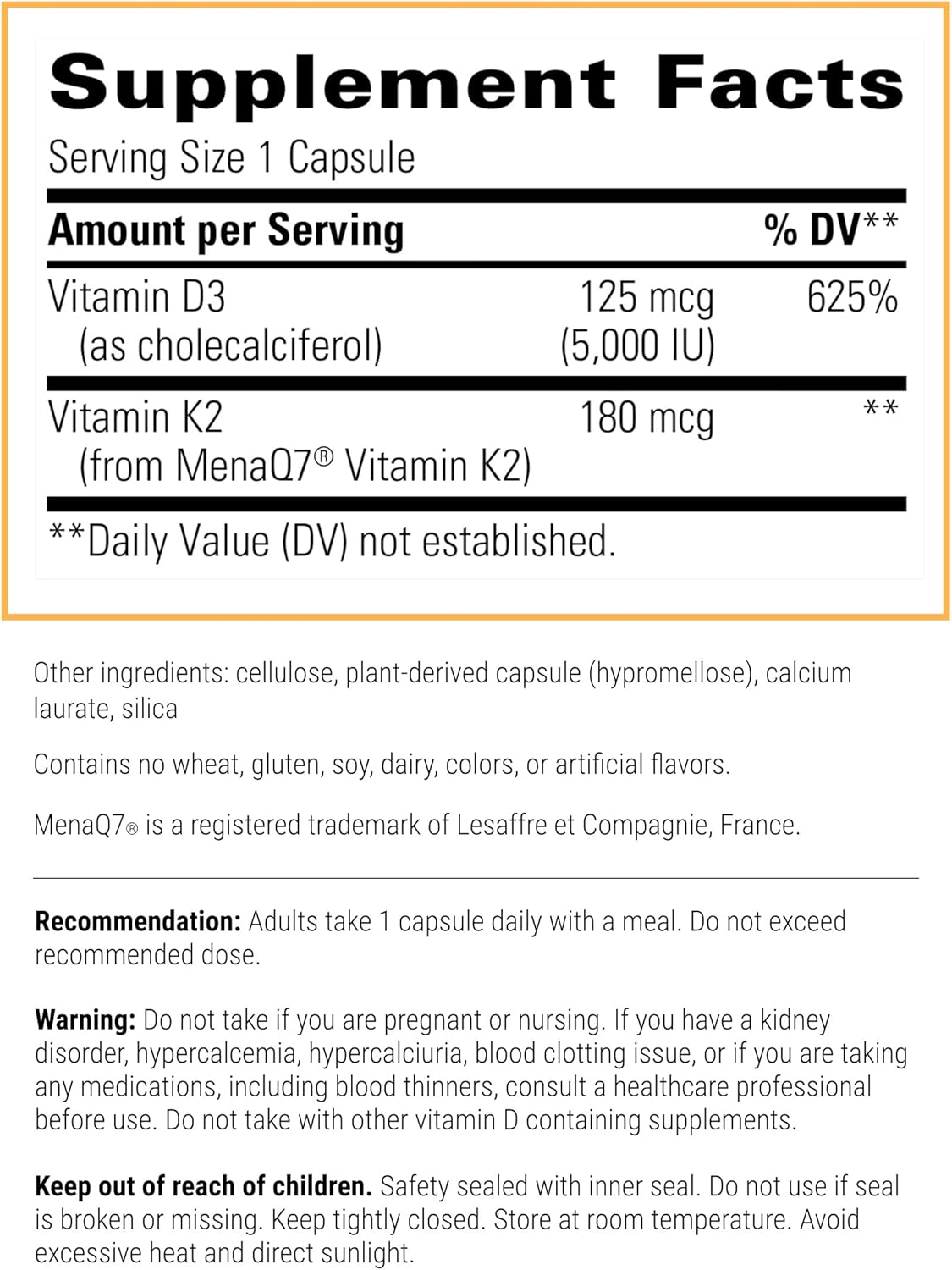 Adults seeking health support for an active lifestyle may take this supplement. Adults take 1 capsule daily with a meal. Do not exceed the recommended dose. K2 Plus D3 does not contain wheat, gluten, soy, dairy, or artificial colors or flavors.