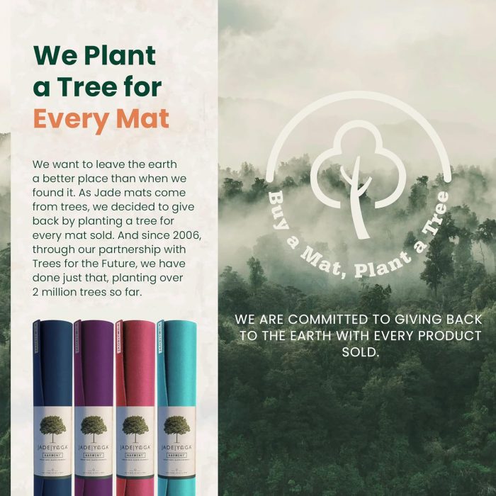BE THE CHANGE WITH JADEYOGA: When you choose JadeYoga, you’re not just investing in a premium yoga mat; you’re actively contributing to positive change. With every mat sold, we are dedicated to giving back to the earth. We’ve pledged to plant a tree for each mat purchased. Since 2006, in partnership with Trees for the Future, we have already planted over 2.5 million trees, making a tangible difference in reforestation efforts and preserving our planet for future generations.