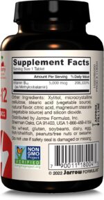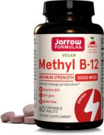 Jarrow Formulas Maximum Strength Methyl B-12 5000mcg Chewable Tablets make it easy for people with Vitamin B12 deficiency, vegetarians, vegans, and people over 50 to get daily brain health and cellular energy support. Made with high-quality, non-GMO ingredients, this vegan and gluten free dietary supplement contains no wheat, soybeans, dairy, egg, fish, shellfish, peanuts, tree nuts or sesame. Methyl B-12, the active form of Vitamin B12, is naturally recognized, better absorbed and retained than cyanocobalamin by the body to support cellular energy production and help maintain brain health and sleep. Each cherry-flavored chewable tablet delivers 5000 mcg of Methyl B-12, providing high levels of B12 and protects brain cells and nerve tissue and provides neurotransmitter support and reduces homocysteine to the essential amino acid methionine. Adults, take one chewable tablet once a day or as directed by your qualified healthcare professional. Informed by strong scientific research, Jarrow Formulas products are carefully crafted to ensure you get the benefit of each and every vitamin, mineral and supplement.