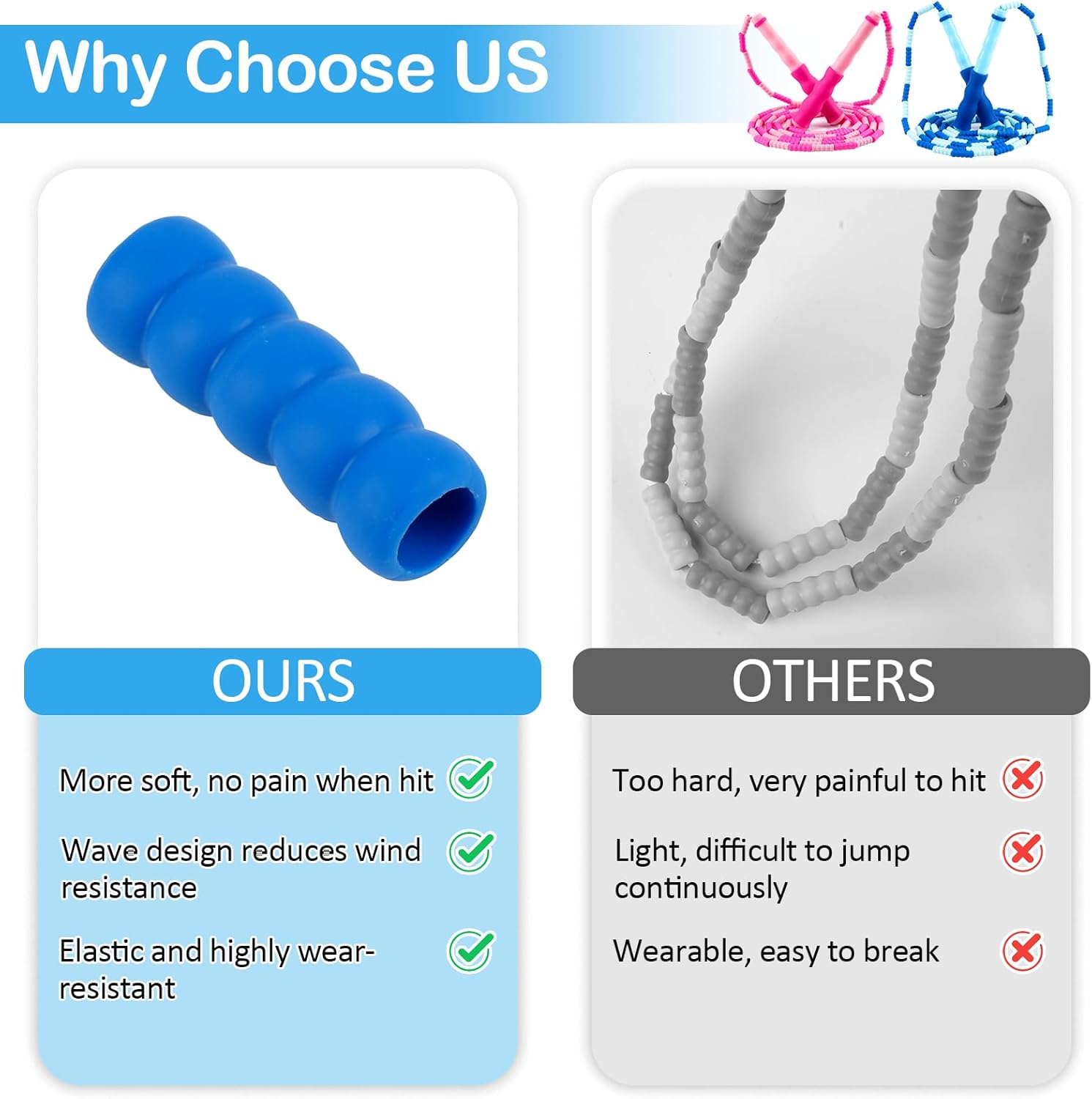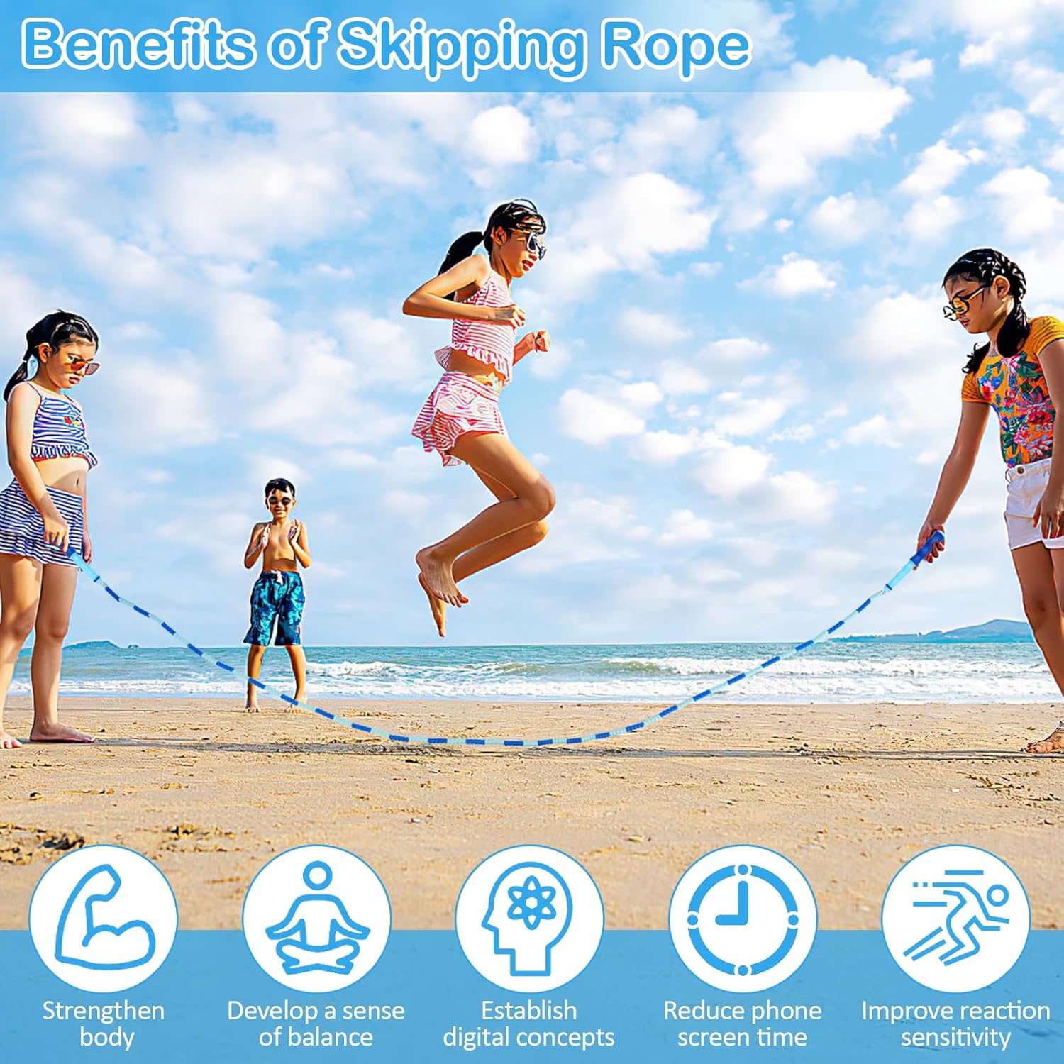 Pliable Material: Kids jump rope for age 8-12 is made of lightweight pliable material, so they’re not hard. It doesn’t hurt when hitting your legs.Great for outdoor play this summer
