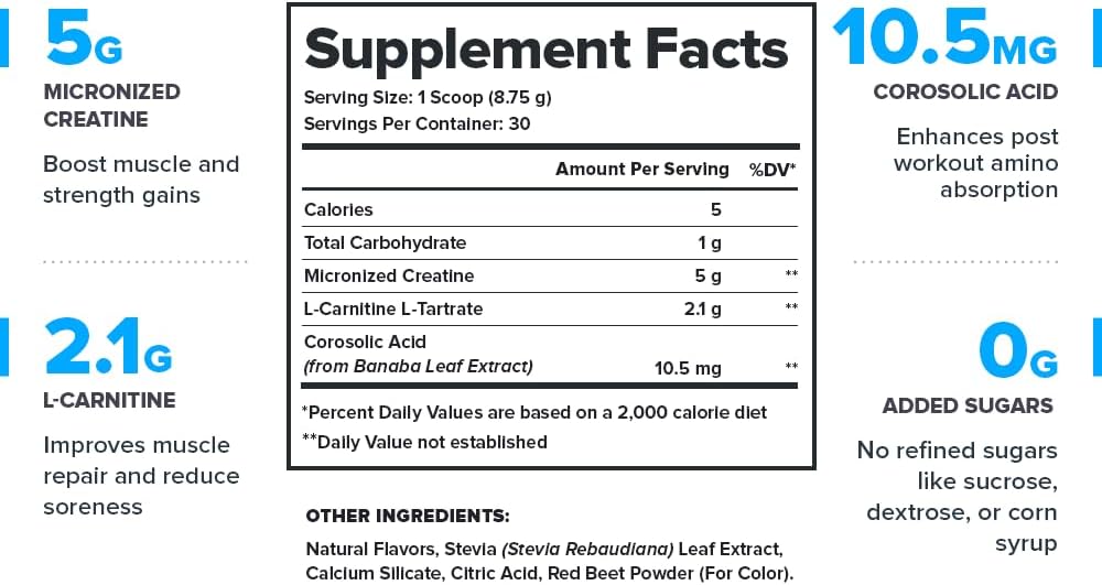 Clean creatine powder for men and women and transparent label that shows exactly what’s in every serving of our recovery drink and what’s not (no proprietary blends or hidden ingredients).